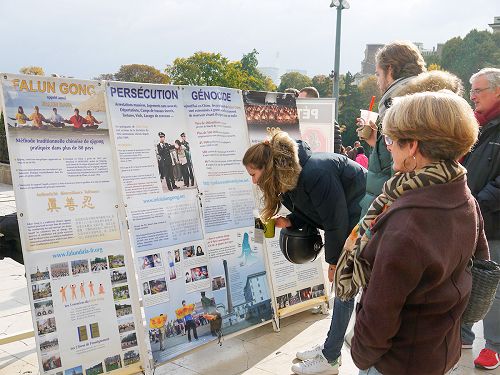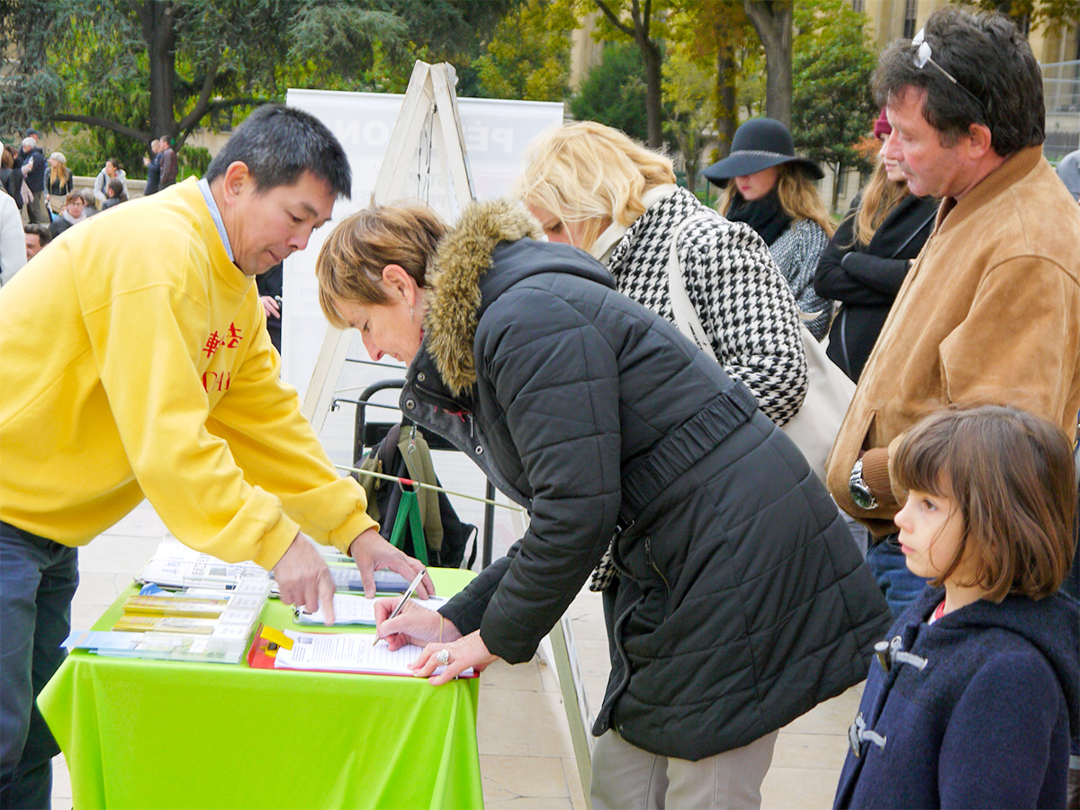 Myriama Guerrard女士是位麻醉师,她曾经去中国学中医。她的儿子常去中国, 并练习武术。儿子曾经告诉她法轮功在中国被迫害一事。今天第一次遇见法轮功,Guerrard女士立即在征签表上签了字。她很相信气功,并表示:“我支持法轮功!我也希望中国政府能够理解(法轮功),(法轮功)真相能够澄清。”她还希望中国法轮功修炼者能拥有自由炼功的环境,这对健康非常有益。
