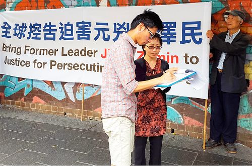 ![]() 图1-3:悉尼市民纷纷签名谴责中共活摘法轮功学员器官,并声援诉江 |