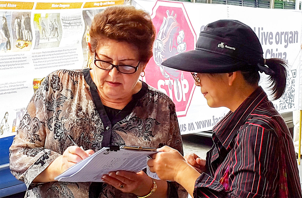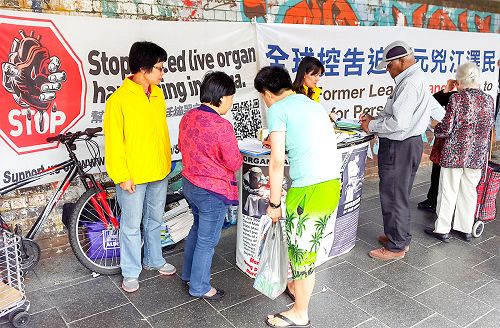 在附近工作的医生帕先生(Vithilee Par)在走过法轮功学员身边时,主动拿起征签表,在谴责中共活摘法轮功学员器官和声援诉江的征签表上一一签名后,称赞法轮功学员:你们正在做的事是一种最好、最有智慧的方式,让人们了解真相,制止迫害。