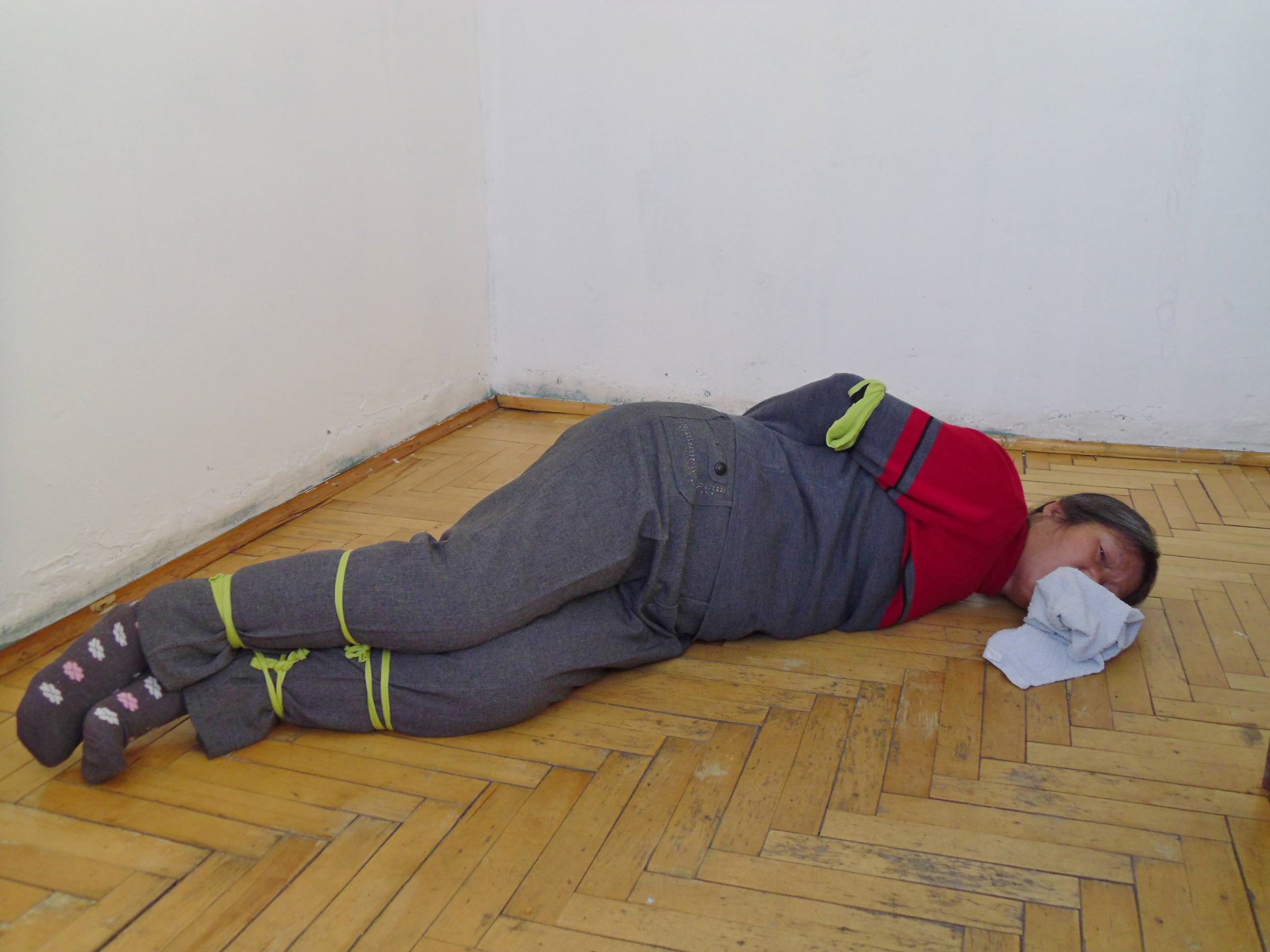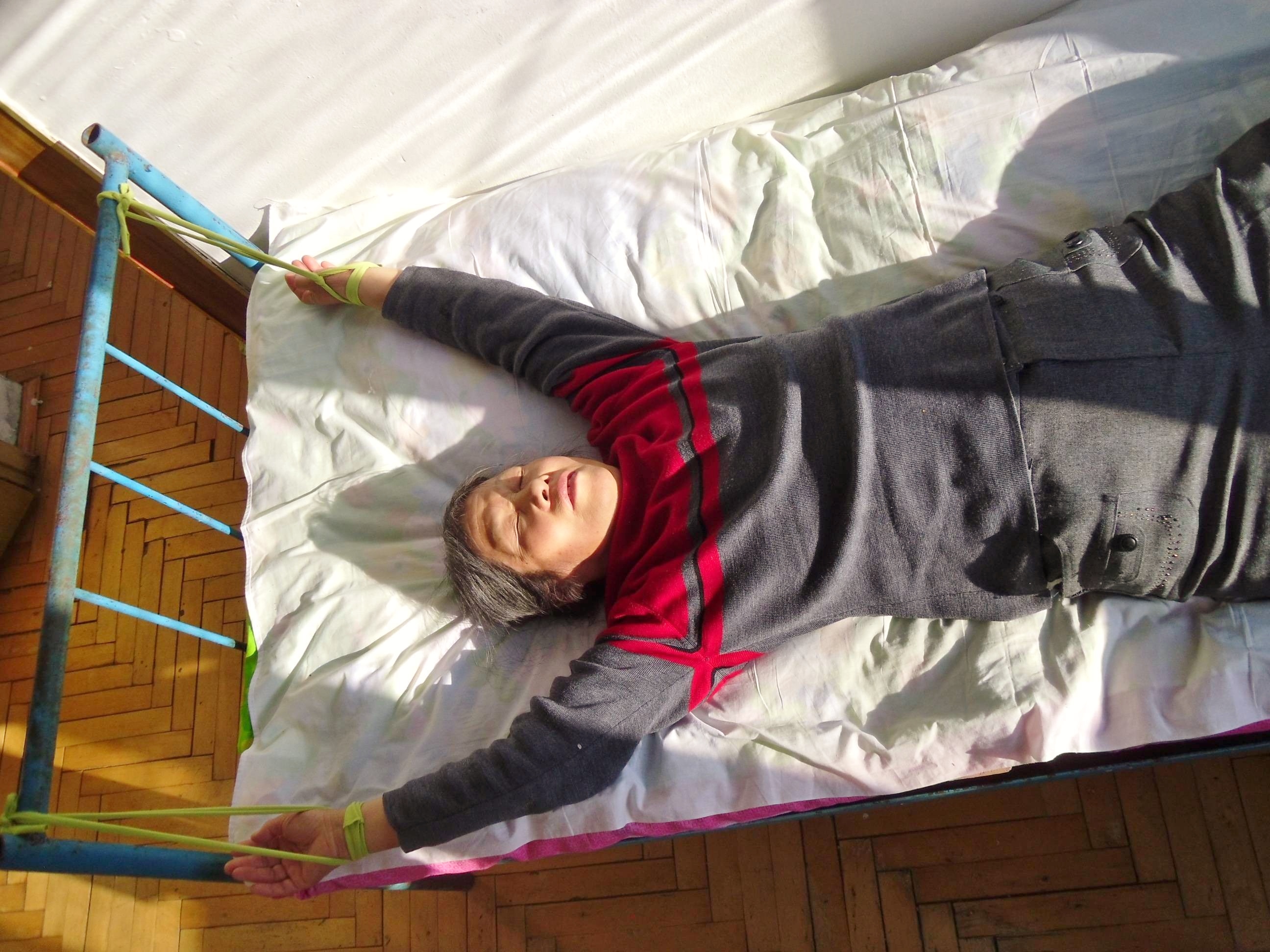 二零一一年三月三日,狱长白英贤到黑龙江女子监狱住院处来“看”我,把原来的两个恶犯包夹又换成了四个包夹,她们是刑事犯李玉波、刑国辉、王淑贤、白玉明。恶犯杨秋香跟白英贤说我不穿囚服。随即,刑事犯高福艳拿着束缚带就要捆绑我,说是狱长批准的。因为几年的残酷迫害,我已是骨瘦如柴。为了把我捆得紧一些,恶犯高福艳把束缚带,重新扎了几个眼,我经常被捆得紧紧的,手和脚被勒得发紫。因为捆得过紧,他们解束缚带时都很费劲,没有一点活动余地。