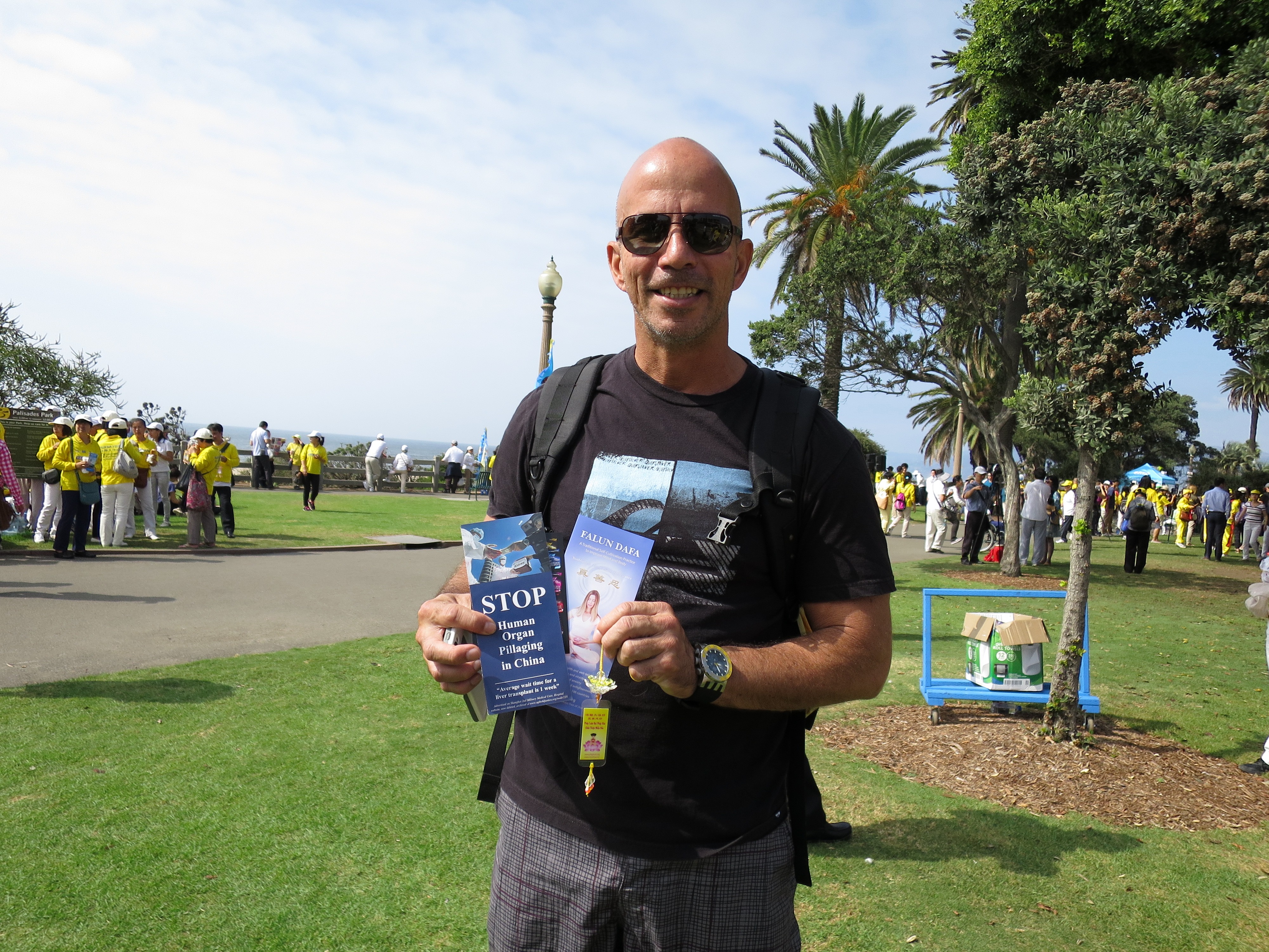 他于二零一五年十月十七日在美国洛杉矶圣塔莫尼卡海滩(Santa Monica)遇到法轮功学员,那时他刚刚运动完,骑着自行车看到海滩旁延绵数不绝的法轮功学员展示功法、集会的队伍,也看到法轮功学员正在打坐,他说自己完全被吸引住了,于是坐下来和学员一起炼功,感觉很好。