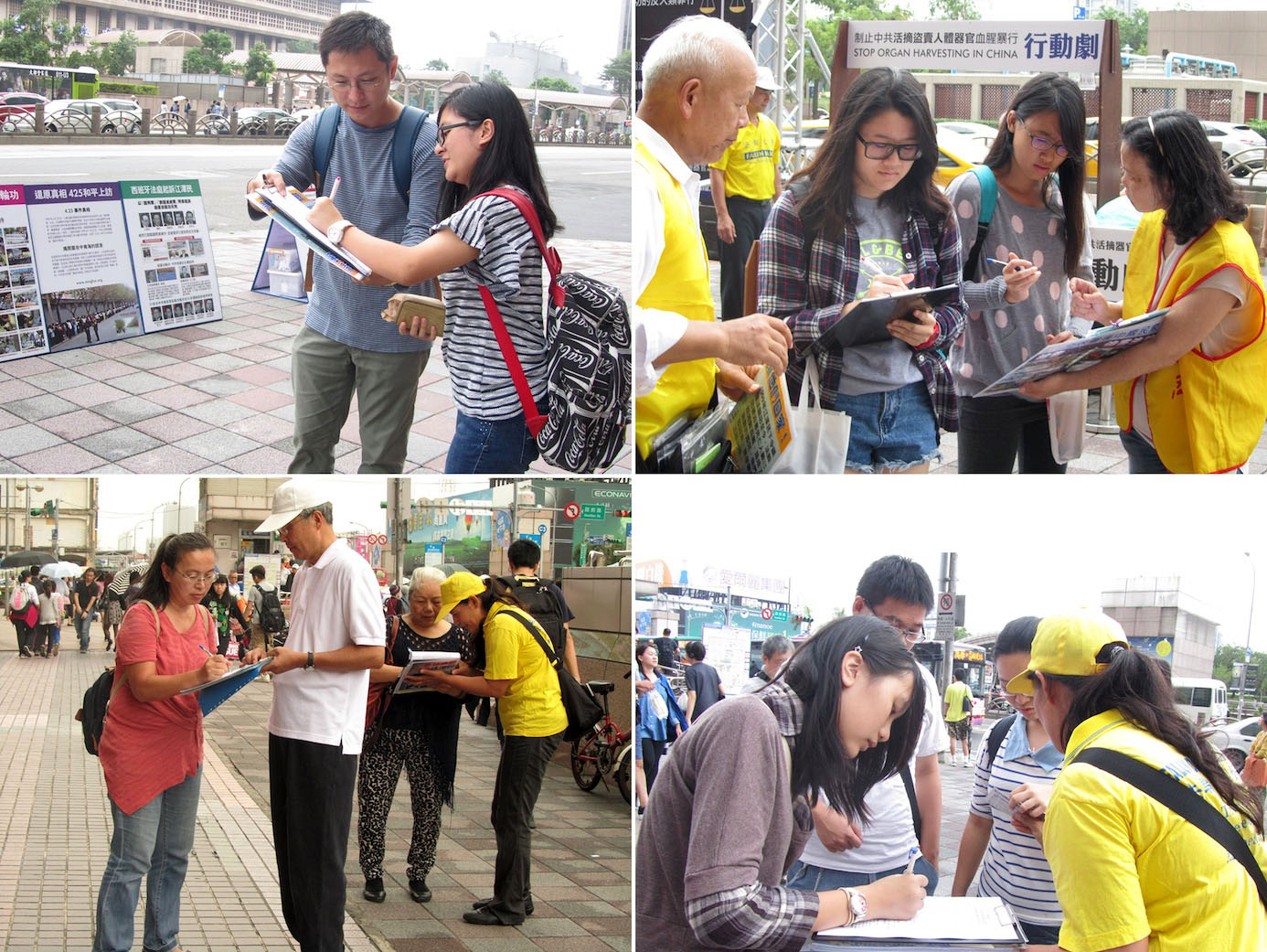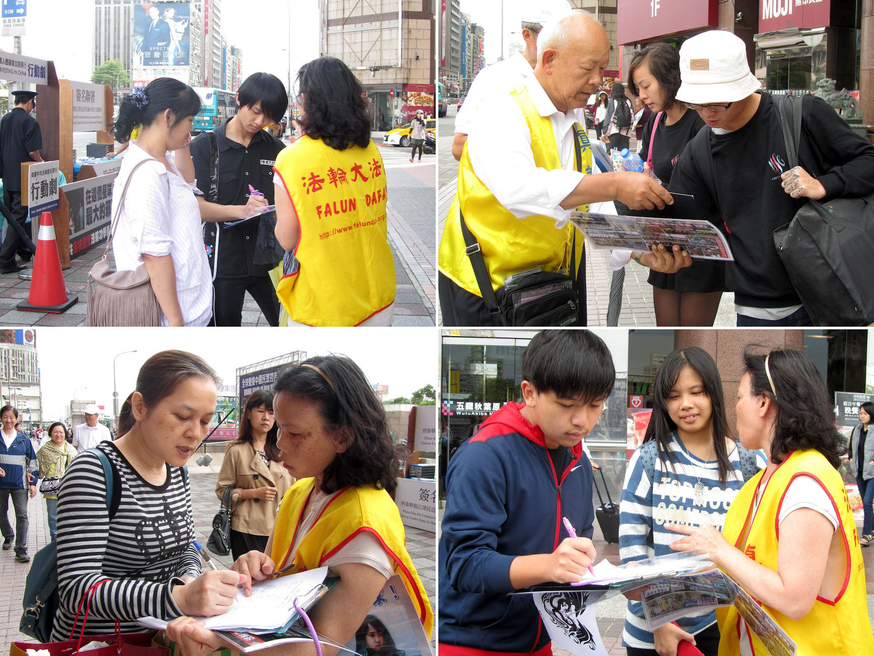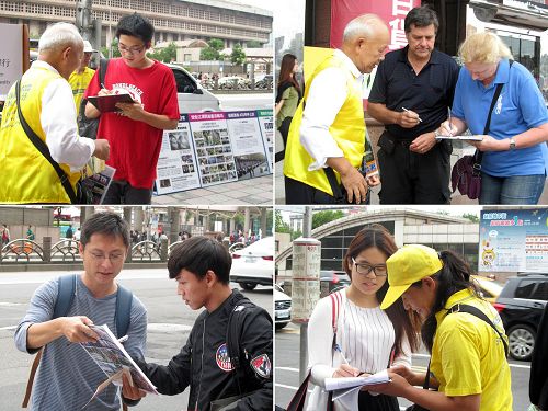 来自韩国的孙小姐遇到法轮功学员马上就在举报书上签名,她说在韩国就已知真相,因此非常支持诉江。也是从韩国来台旅遊的赖、李、赵三位小姐拉着行李箱,在征签点对面的商业大楼门边等待同伴一起出发到下个旅遊点。三人静观一段时间,眼看真相资料、耳听学员说明之后,也在举报书上签名,李小姐手指真相展板,用生硬的华语说“希望帮助他们(指法轮功学员和因受迫害而无家可归的孤儿们)回家,所以要签名支持。”