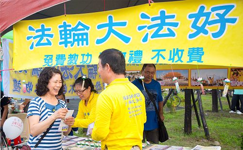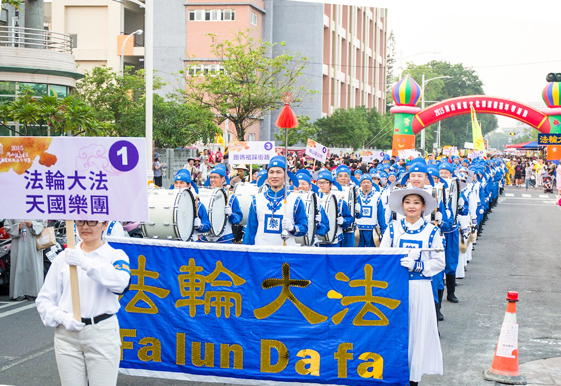 法轮功学员的队伍中间是活泼亲切的腰鼓队、美丽的法轮大法旗帜队和优美祥和的炼功队伍,两天的活动中还设有“法轮大法好”展位,给社区带来祥和、健康与希望。高雄市长陈菊与会,特别感谢法轮功天国乐团对地方大型活动的支持,也有不少民众当场想修炼法轮功。