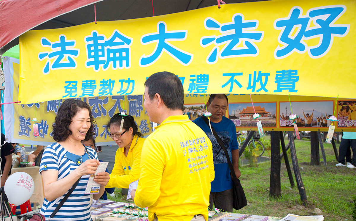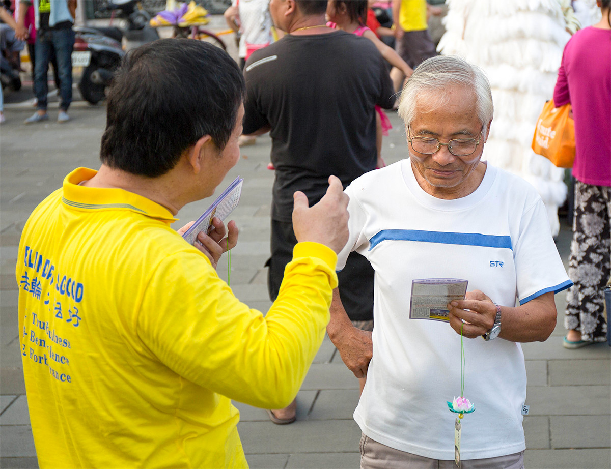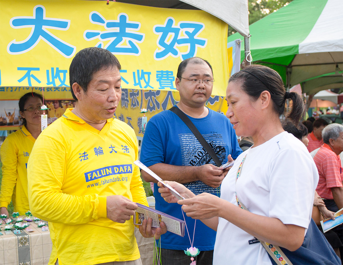 在法轮大法摊位上有不少民众过来索要法轮功传单和莲花,向学员询问炼功点,一位年轻人很感兴趣的说:“法轮大法好,真善忍好,我也想炼炼看。”一对老夫妇看到今年已七十多岁、健康硬朗的弘法学员阿趁,羡慕地了解年轻健康的秘招——修炼法轮功,抄下了炼功点和电话,迫切的想走入大法修炼。