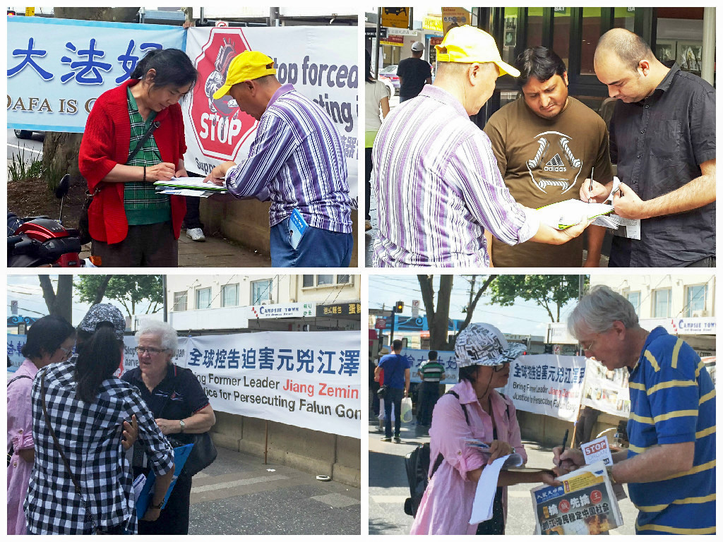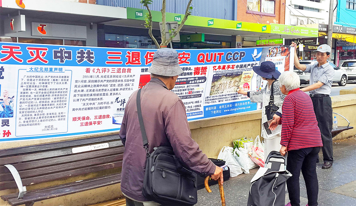 ![]() 图1-4:法轮功学员在悉尼西南部的中央商务和行政中心Campsie的主街举行真相长城及征签活动,不少路人驻足了解真相。 |