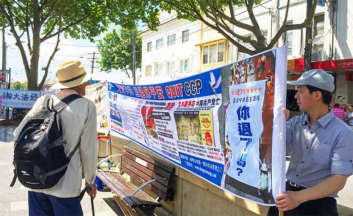 ![]() 图8:越南裔Zavi Khan女士(右)正在与法轮功学员攀谈,了解真相。 |