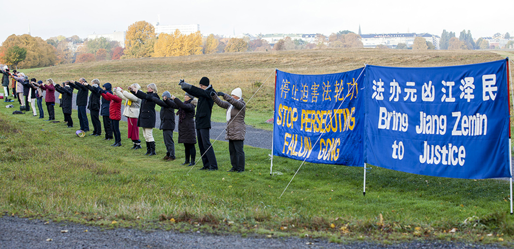 ![]() 图1:瑞典学员在中使馆前和平抗议,呼吁法办元凶江泽民。 |