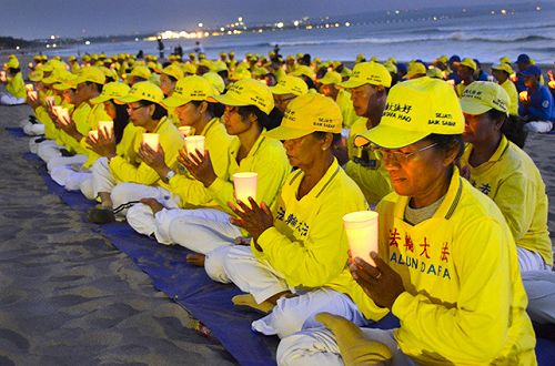 图7-8:印尼学员在海滩上举行烛光悼念活动,悼念在中国被中共迫害致死的法轮功学员 |