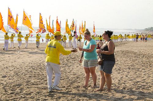 图2:上百名法轮功学员组成腰鼓队、锦旗横幅,在长达四公里的乐吉安海滩举行游行 |