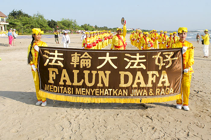 【明慧网二零一五年十月三日】印尼法轮大法修炼者于九月二十五日(星期五)下午,在巴厘岛海滩举行大游行。由天国乐团在最前头领航开路,上百名法轮功学员组成腰鼓队、锦旗横幅,在长达四公里的乐吉安海滩(Legian Beach)行进了一圈,又回到原点。