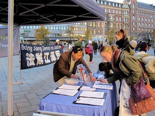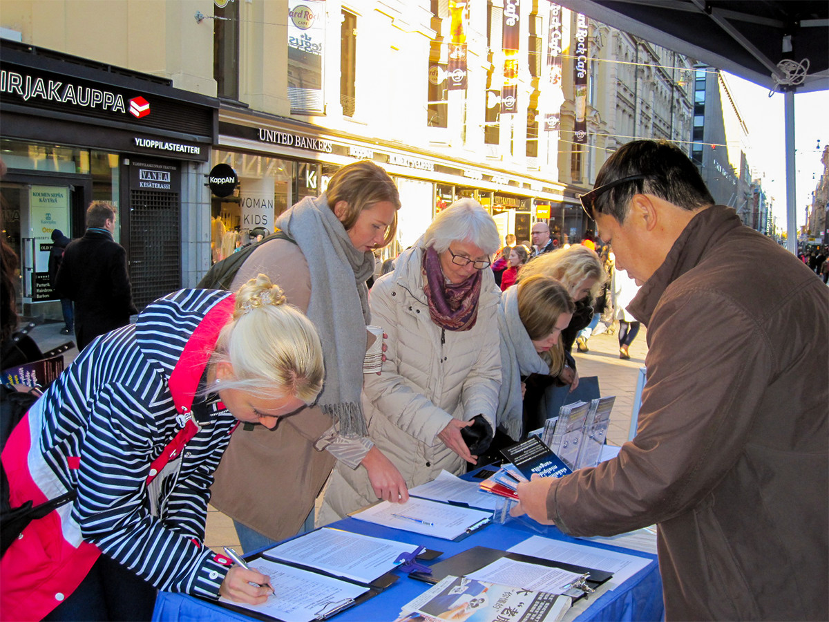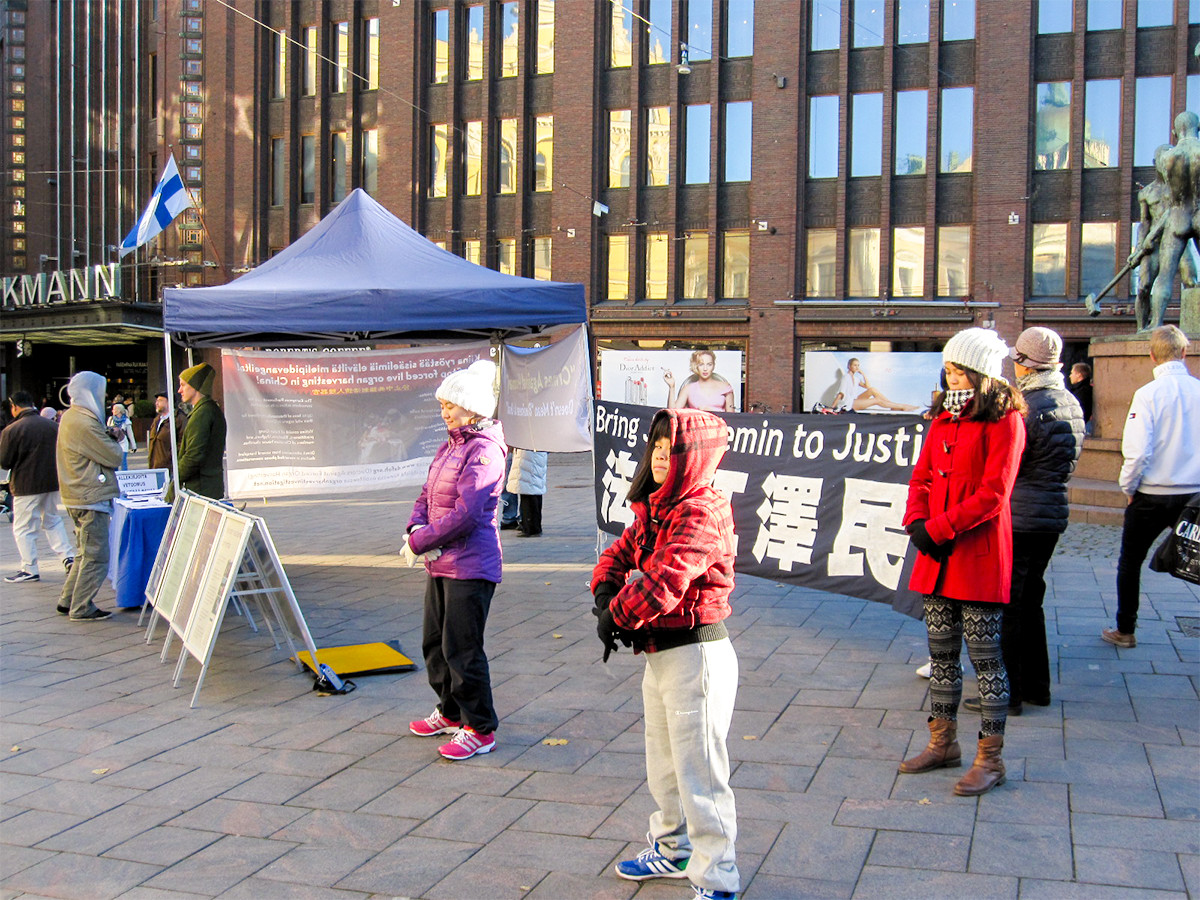 ![]() 图1:芬兰学员在市中心广场传播法轮功真相 |