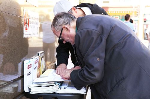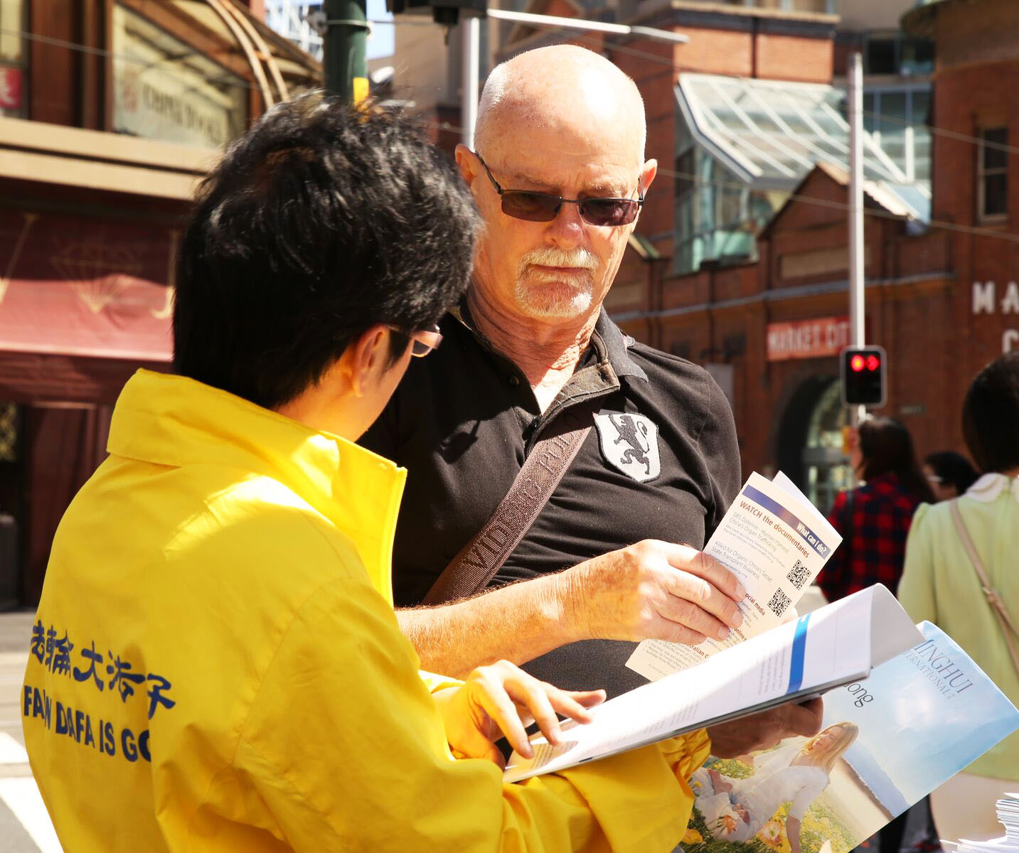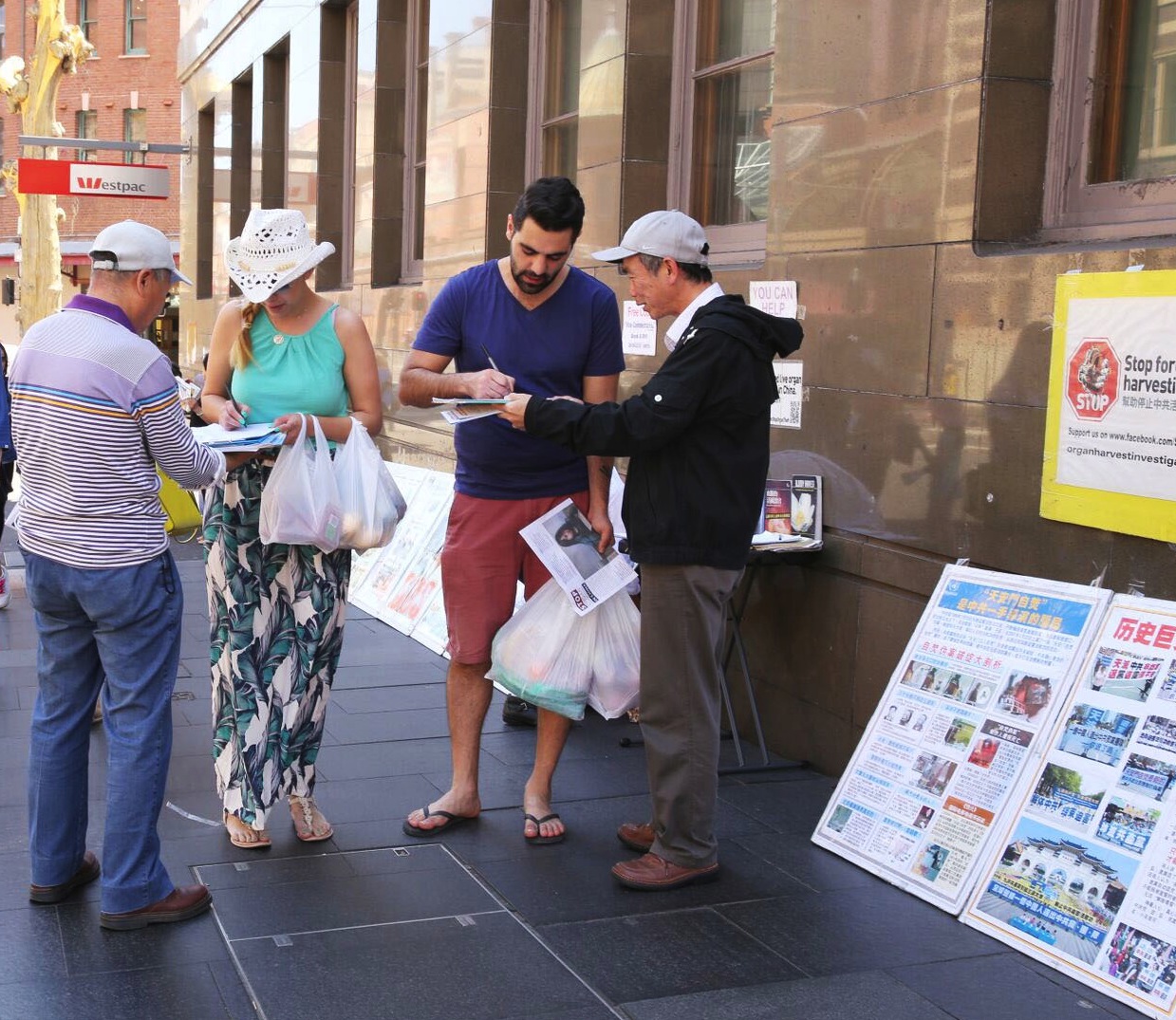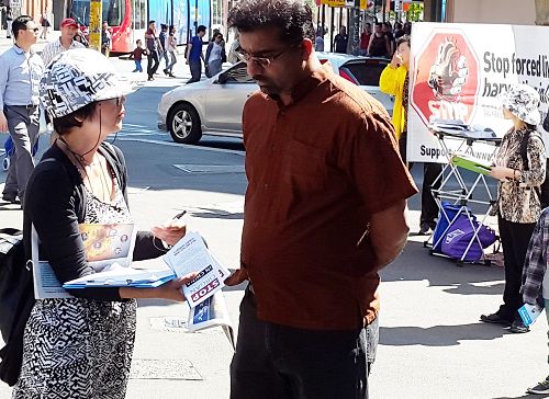 一位名叫安东尼(Anthony)的西人男士在中国城的法轮功真相摊前停下来,认真听法轮功学员关于中共活体摘取法轮功学员器官的陈述。他接下了几份真相资料,并在制止“活摘”征签表上签了名。他告诉法轮功学员,他在网上了解到一定的有关“活摘”的信息,并表示这是不能接受的事。他说,用请愿书签名的方式,呼吁澳洲政府向中国政府提出人权问题是一种可行的方法。并表示,如果政府因经济利益而无视人权问题是不对的。