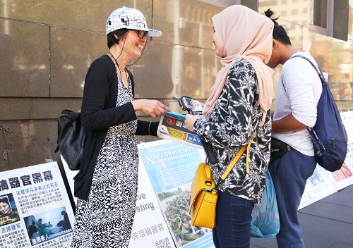 澳洲女士贝琳达(Belinda Alafaci)女士在酷暑当空时在真相展板前看了很久,当记者询问她知道法轮功被迫害消息时,她告诉记者:我看到过报道法轮功学员被中共“活摘”器官的文章,并在这里看到过多次展示“活摘”的真相摊位,我感觉这事非常糟糕!今天我还听闻超过十八万法轮功学员在中国起诉迫害法轮功的元凶江泽民,我感觉这太好了,我希望法轮功学员会赢!我刚刚在法轮功学员征集制止“活摘”和声援“诉江”表上签了名支持他们。我希望这个独裁者会得到应有的报应。(中共)政府并没有让人们过和平生活,政府自己挪用公款。法轮功学员祥和修炼却得不到公平待遇,还要受到迫害,真恐怖!