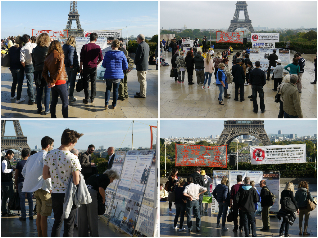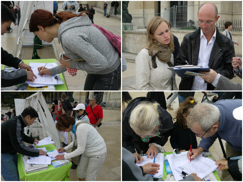 在征签表上签名的人中有很多是法国民众,还有来自世界各地的游客,也有居住在巴黎的华人。每个签名都发出了一个共同的心声,正如一位法国女士所说:“我与那些维护和平的人站在一起,力争让这个世界不再存有极权专制!”