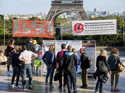 ![]() 图1-3:巴黎景点上,大陆游客观看法轮功真相展板 |