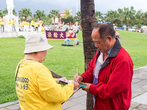花莲民众了解真相后,纷纷在刑事举报江泽民的联署书上签名。有人对法轮功学员说:“你们要加油!”有人询问:“能为你们做什么?”有的说:“在别的地方已经签过名了,加油!”有人表示看过媒体的报导,知道中共迫害法轮功很多年了,立即签名举报江泽民。