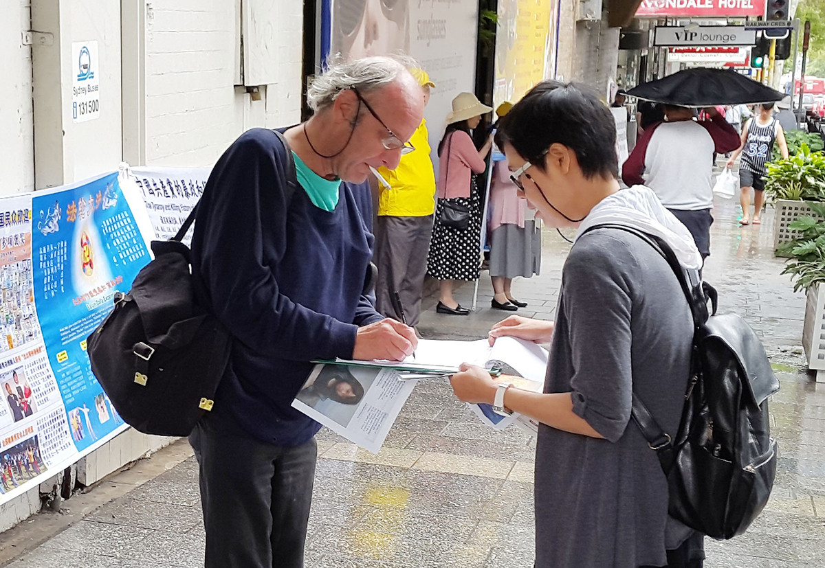 斯图尔特·芬德利(Stuart Findlay)先生走过真相横幅前,停下脚步签名支持法轮功反迫害,他表示:活摘器官太邪恶,太坏了,真是让人无法想象的可怕!这是为何我签名支持制止迫害的原因。我会请我的亲朋好友都去看还在澳洲电视台SBS Dateline网页上那个揭露中共非法活体摘取法轮功学员器官牟取暴利的纪录片《活摘》(Human Harvest)。