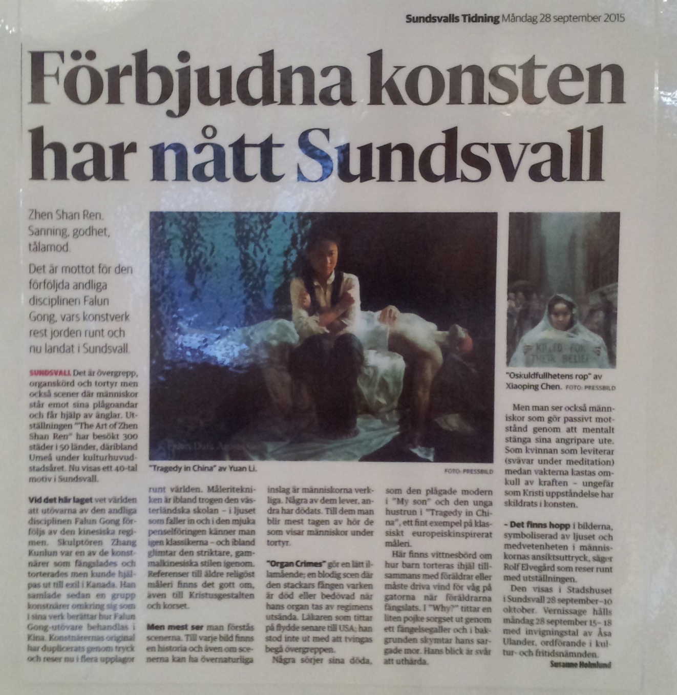 松兹瓦尔市的主要日报《松兹瓦尔报》在美展开幕当天刊登出推荐文章《被禁艺术品来到了松兹瓦尔》。文章中解释了“真善忍”三个字的瑞典文是什么,还介绍了美展的作品表现了修炼法轮功的美好、法轮功学员在中国遭受到的迫害,特别是被活摘器官,以及法轮功学员坚持和平反迫害的勇气。文章说,“真善忍国际美展”已经在五十多个国家的三百多个城市展出了,现在终于来到了松兹瓦尔。