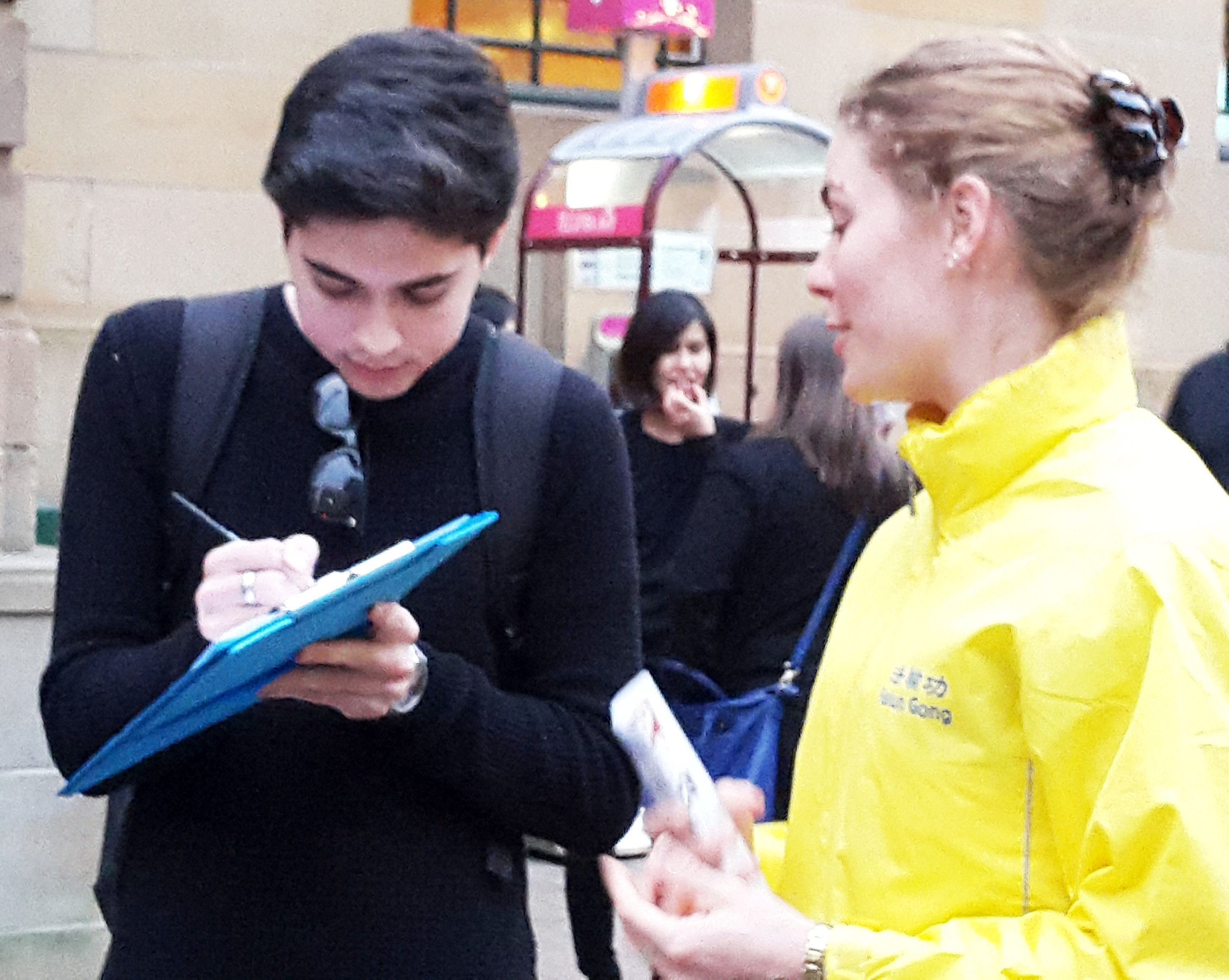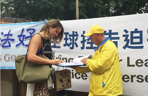 ![]() 图9:在附近上班的澳洲人迈克尔(Michael A)先生主动签名支持制止“活摘”和声援中国民众控告迫害法轮功的元凶江泽民。 |