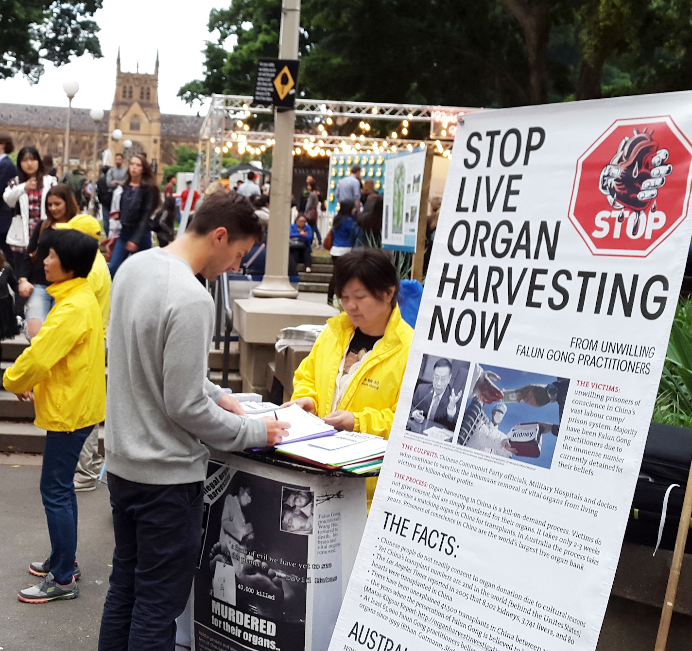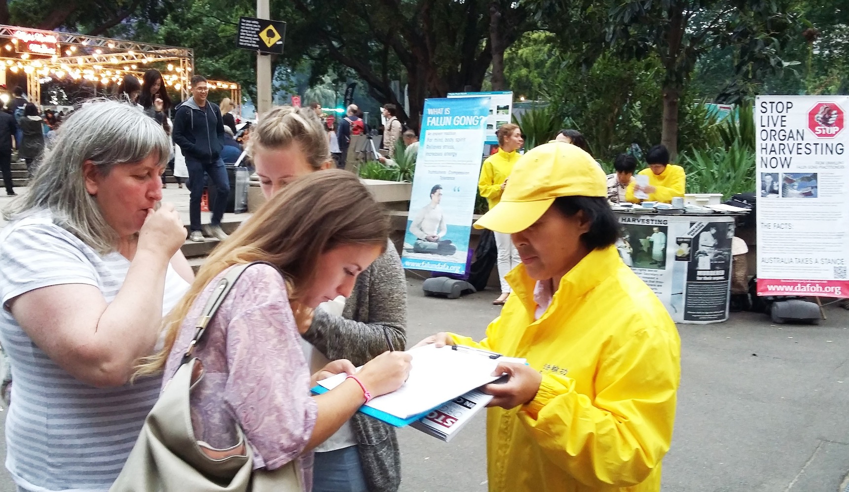 ![]() 图7:从英国来澳洲旅游的帕姆、黎安倪和朋友(Pam Poche 、Leanne Roche)看到“活摘”消息非常震惊,正在签名制止迫害。 |
