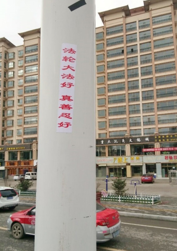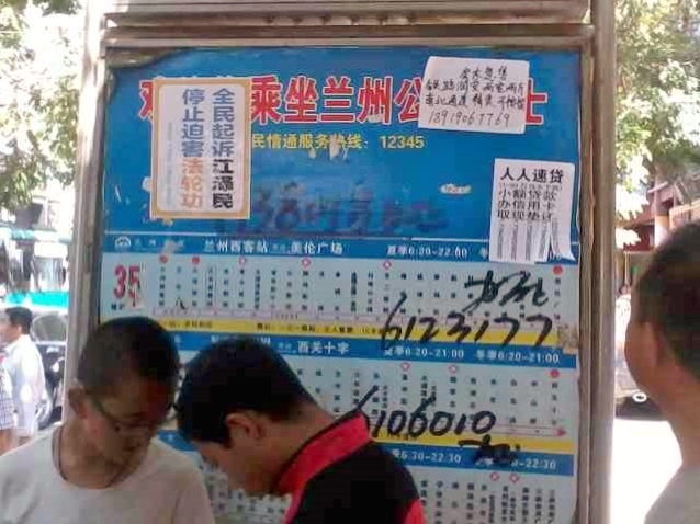 在兰州的街头巷尾、公交车站和闹市区多处可见“法轮大法好”、“停止迫害法轮功”、“把江泽民送上法庭”、“还法轮功清白”、“审判江泽民”等真相标语。