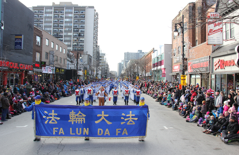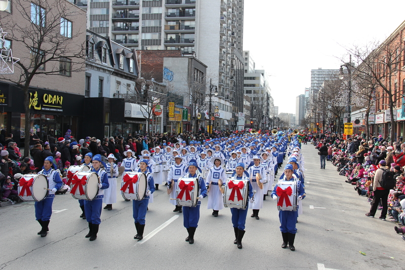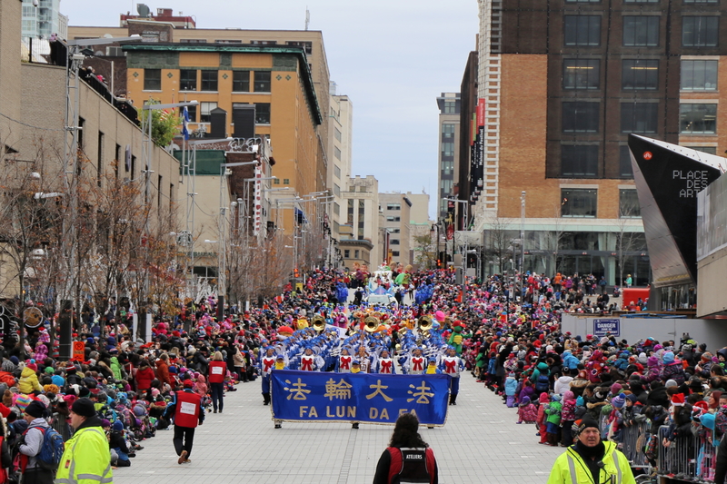 法轮大法天国乐团在圣诞游行中被主办方安排在游行的第一位,天国乐团蓝白相间的中国古装十分醒目,近一百六十人的阵容是今年圣诞游行中声势最为浩大的军乐团,雄壮的乐曲拉开了今年蒙特利尔圣诞游行的序幕,令观众们极为震撼。