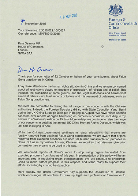 “英国外长们致力于向中共当局提出了我们的这些关注。事实上,在今年八月于北京举行的‘中英战略对话’上,英国国务卿(state secretary)向中共外长杨洁篪提出了这些关注。我们在很多场合提及有关活摘器官的报告,包括今年七月十五日我就书面问题(Written Question)的一次回答。另外,在每年举行的‘中英人权对话’会谈上,我们继续详细地提出我们的关注,最近的一次会谈于今年四月在北京举行。”