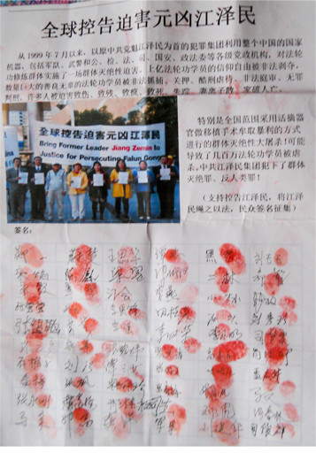 我说:“江泽民下令活体摘取法轮功学员的器官,牟取暴利,他犯的是‘反人类罪’和‘群体灭绝罪’,全世界有正义感的民众都在签名支持控告江泽民,你们也声援一下吧。”他们高兴地都一一签上了自己的真实姓名,也办了三:退.。