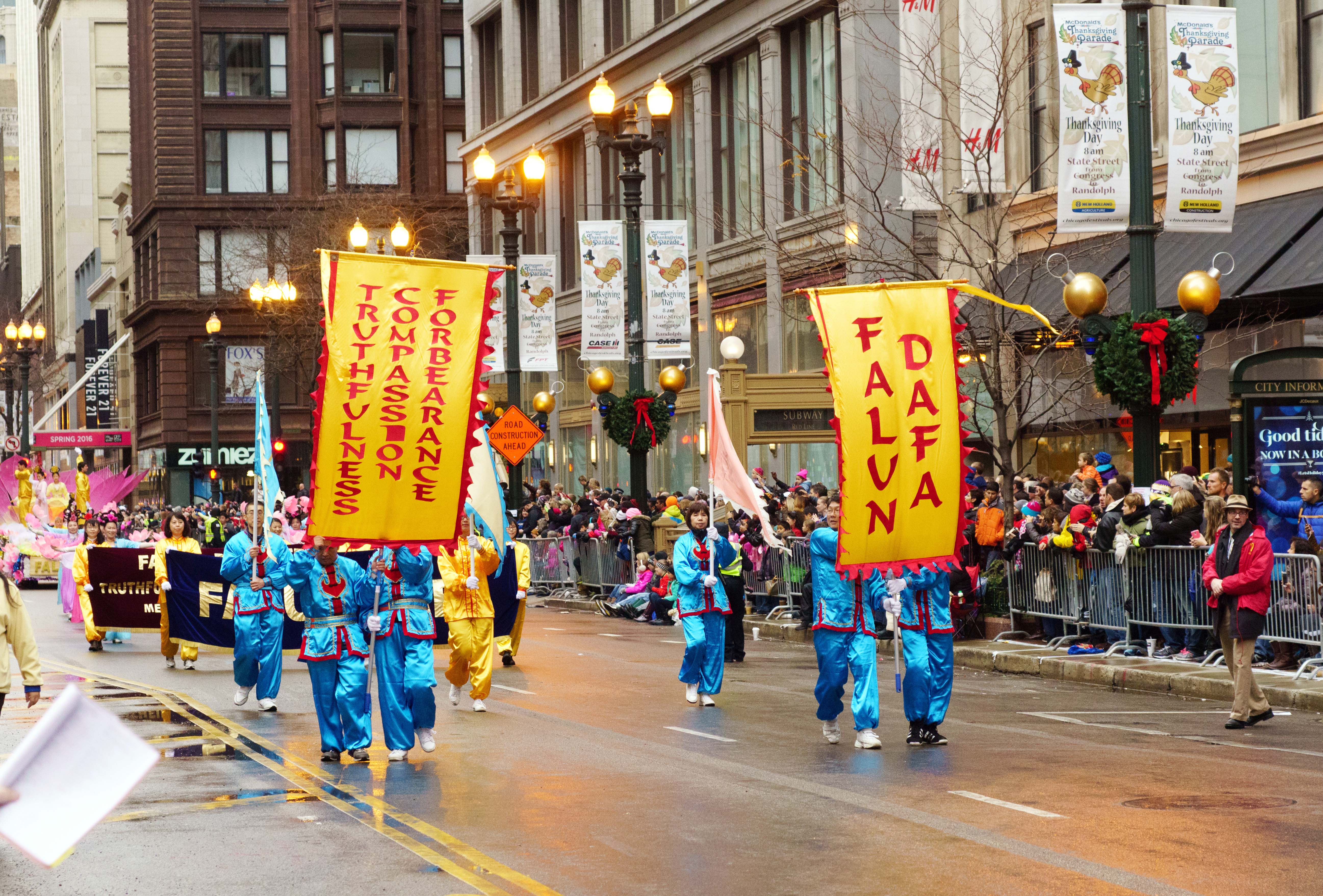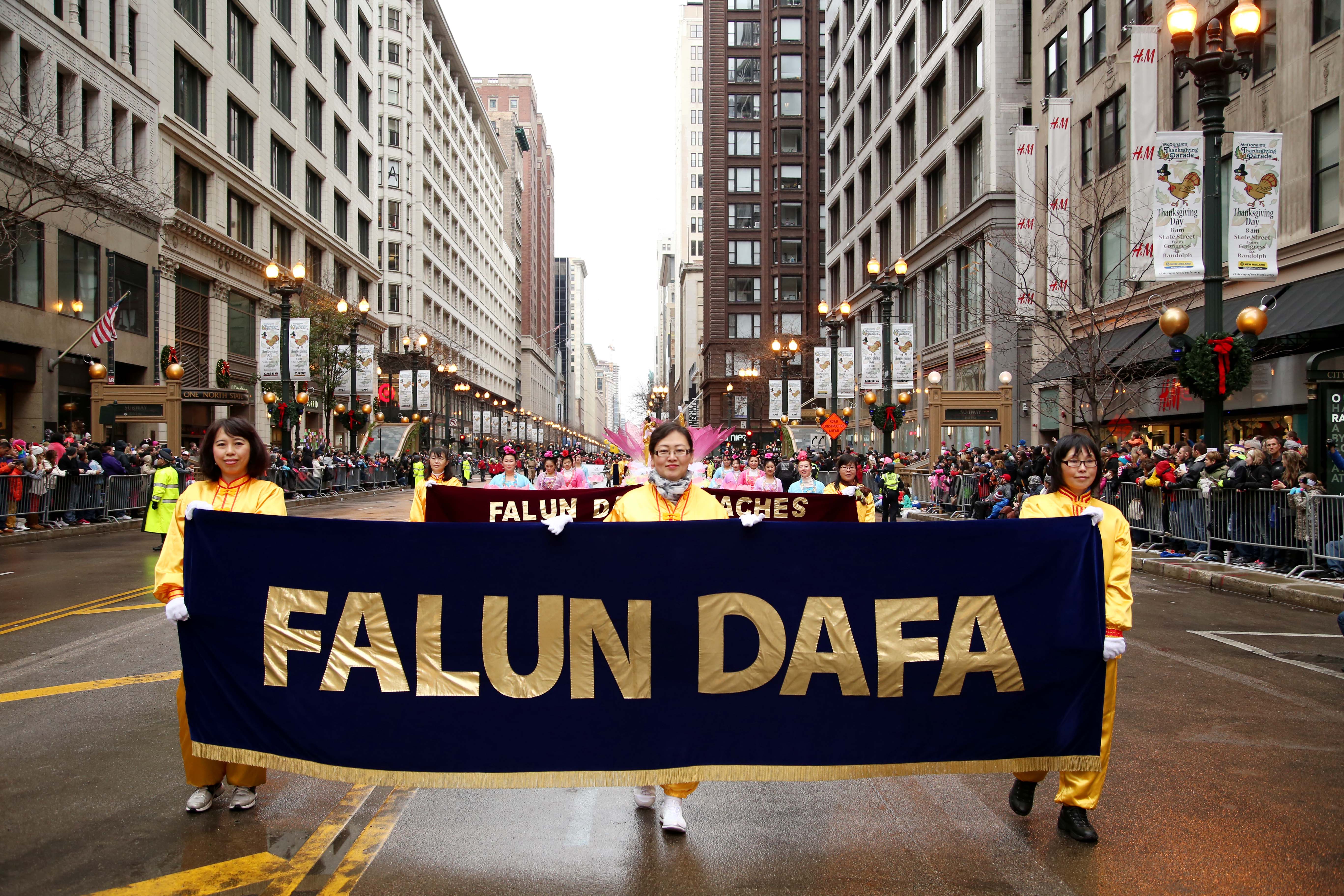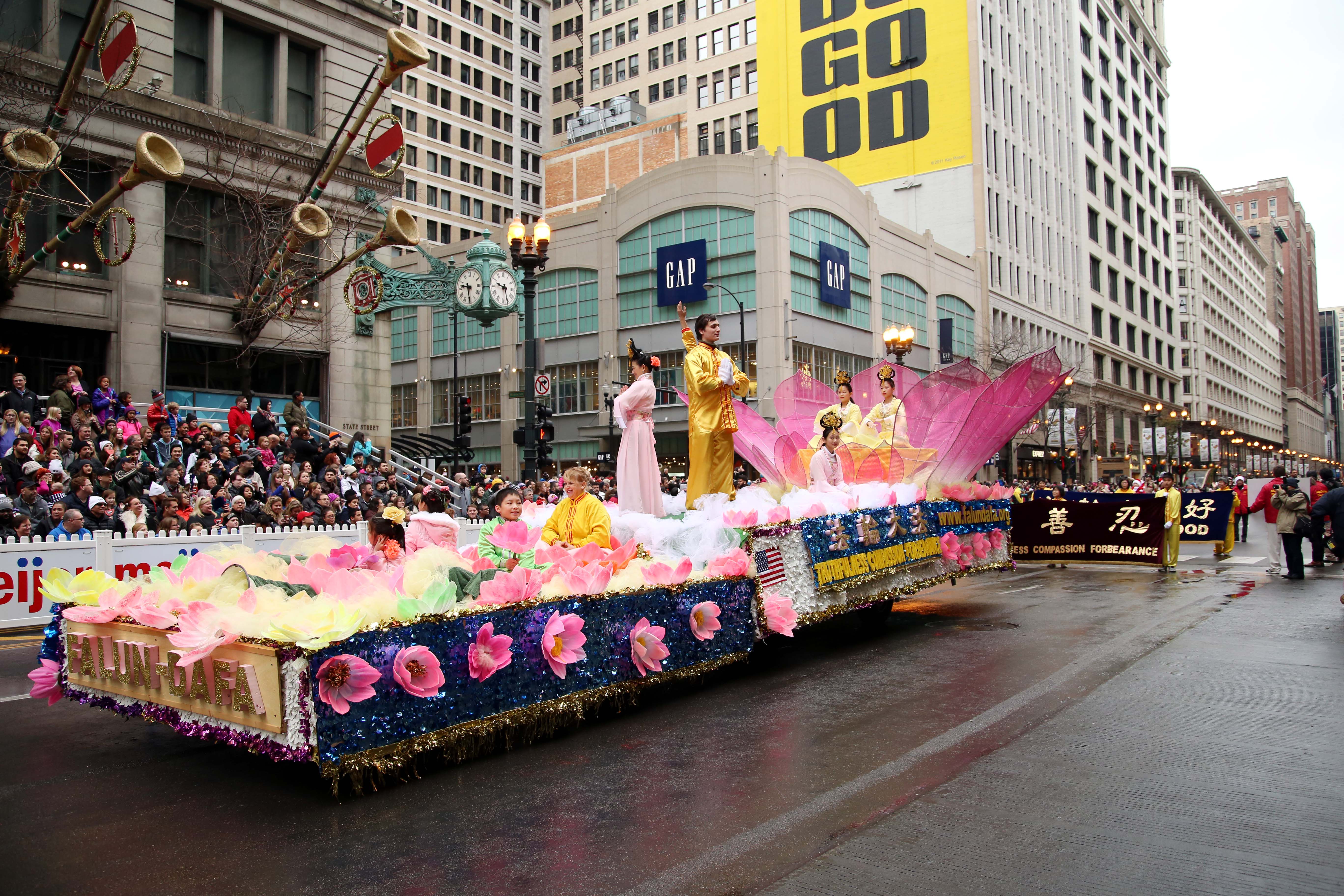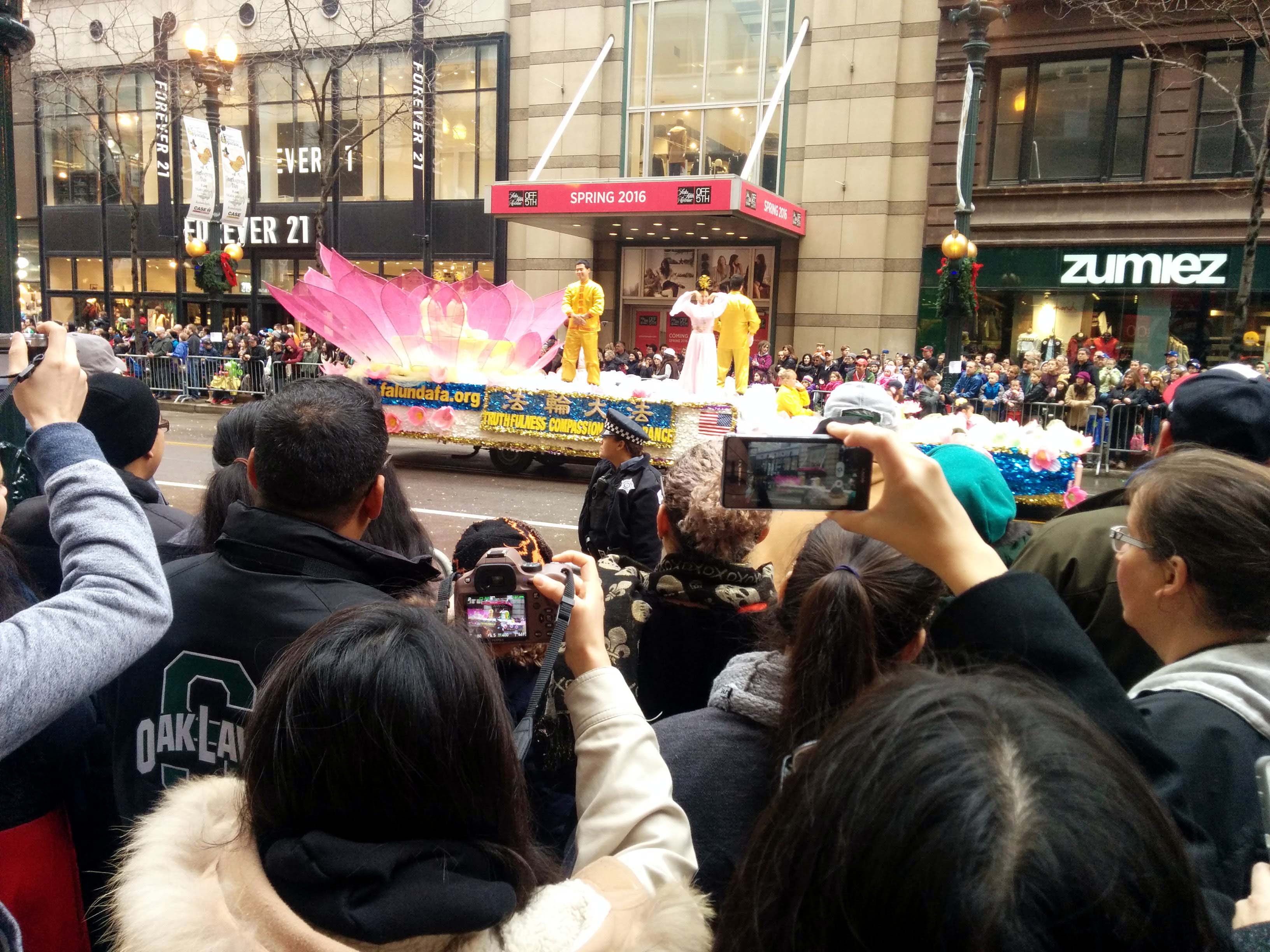 今年可谓芝加哥历史上最温暖的一个感恩节,气温高达五十华氏度(摄氏十度)。法轮功学员的遊行队伍以象征纯洁高尚的粉色巨型莲花为主体形象登场。一人多高的大莲花在整个遊行中十分醒目,各年龄段、不同族裔的法轮功学员在花车上展示功法。约十位清新亮丽的法轮功女学员身着华夏传统服饰,手拿粉色莲花,舞动出莲花图案。