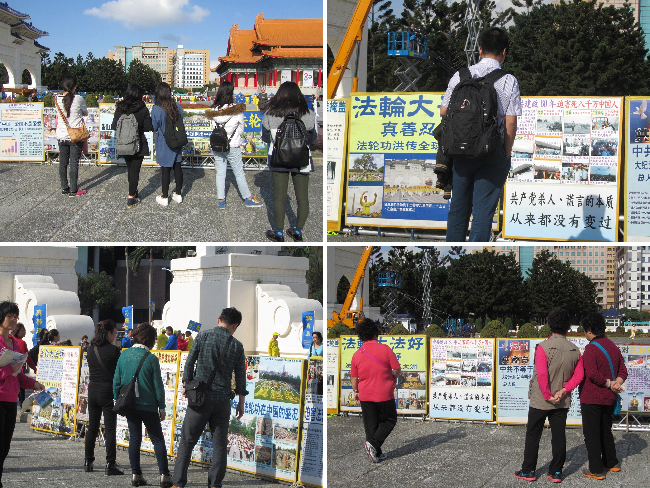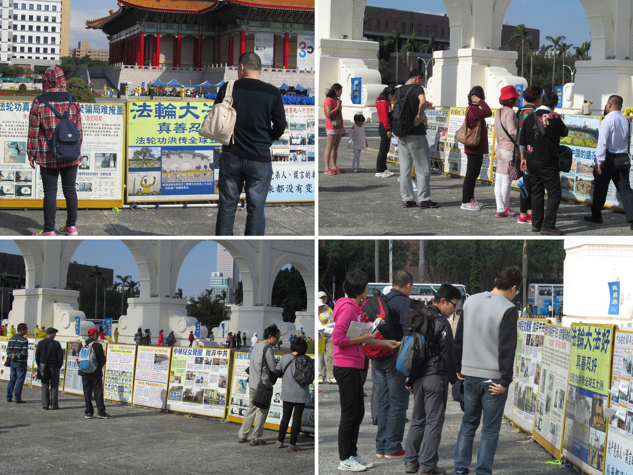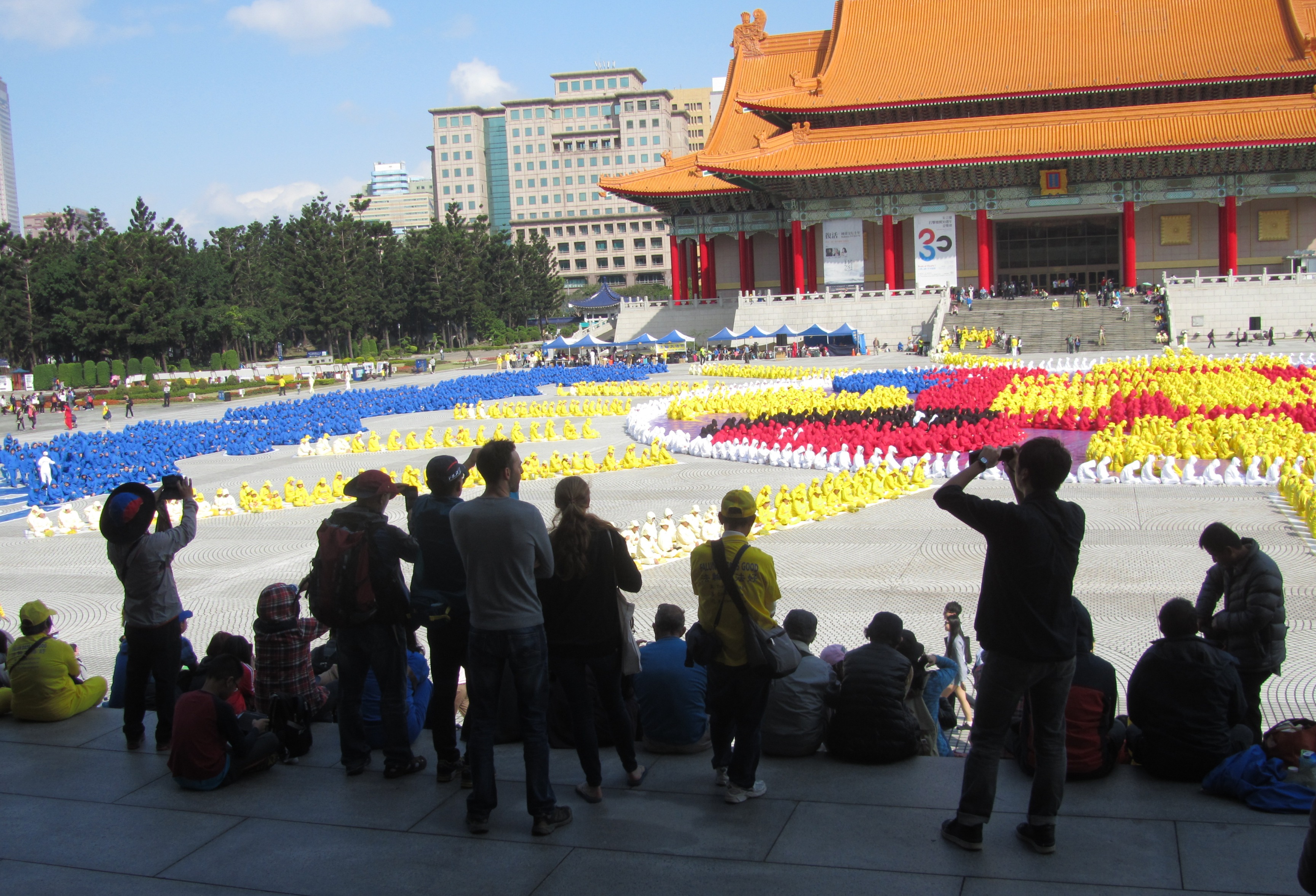 殊胜庄严而又祥和的场面吸引着中外游客和台湾民众驻足聚焦,并纷纷拿起相机拍摄这难得的珍贵画面。壮观场景更深刻地震撼了中国大陆游客,许多人透过在主场周边排列的真相照片展,更深入地了解了法轮功的美好,以及中共残酷迫害法轮功的真相;不少中国人把握良机,请法轮功学员帮忙办理三:退.(退出中国共产党、共青团、少先队组织)。