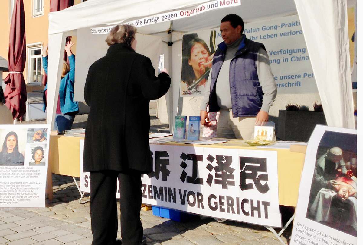 在斯万多夫(Schwandorf)市中心马克特广场(Markt Platz),第一位来签名举报江泽民的是负责法轮功学员集会安全的警察。他很高兴看到法轮功学员的集会,因为他了解到法轮功是平和的,他的工作就省心了。同时他也告诉学员,现在当警察压力大,各种集会经常很混乱,所以他希望法轮功学员最好能上警察局教功,舒缓他们工作的紧张。