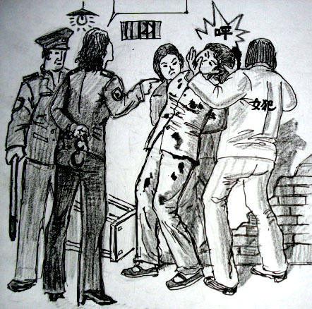 一九九九年十月,我依法进京上访,在天安门广场坐地休息时,无故被抓。因拒绝说出姓名、地址,在天安门分局被上背铐、坐土飞机,心慌腿抖,吐了一大片,全身冒汗跟水洗一样,眼看快晕倒了,解开活动一下,又铐上了,警察边踢边逼问,直到铐子上到最紧。打开后,手铐的牙子勒出的血印深深地吃进肉里,并被关铁笼子四次。后我被非法关进了北京西客站拘留所和体育场。