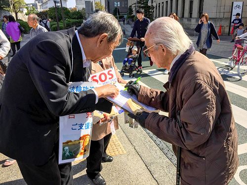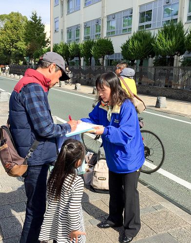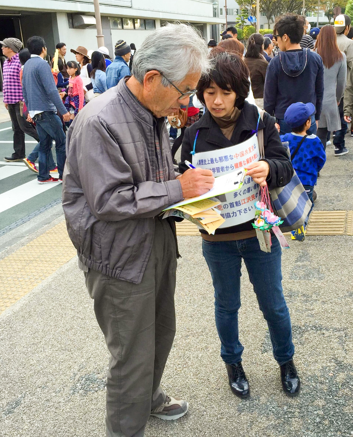 还有一位日本老人签了名字后和学员聊了起来:真心地希望你们中国变好,希望你们(中国)老百姓可以安居乐业,你们要努力啊,真的拜托你们了,要加油啊;一位中年人主动来到学员面前:哦、法轮功,我给你们签名。还有五、六个年轻人听到法轮功学员在中国大陆被残酷迫害,纷纷签名支持,并鼓励学员:加油。