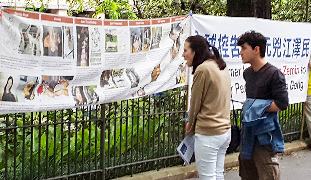 图5:威廉(William Doclins)在真相横幅前驻足看了好久,签名后表示,“活摘”太惨不忍睹,独裁者江泽民应该尽快被绳之以法!