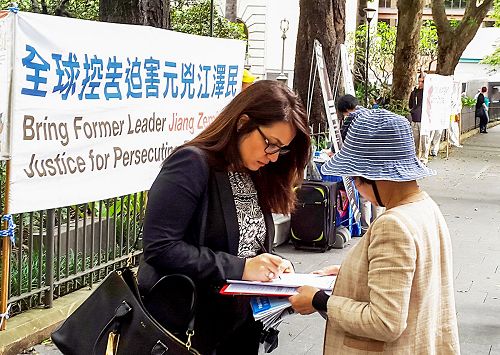 【明慧网二零一五年十一月八日】(明慧记者华清悉尼报道)二零一五年十一月六日下午,法轮功学员在澳洲悉尼最繁华的商务区域之一,温亚德公园前的耀柯街上(York St ,Wynyard Park)展示真相横幅,声援中国法轮功学员控告迫害元凶江泽民,呼吁制止中共活摘法轮功学员器官的罪行。主流社会民众在下班路上驻足了解真相,签名反迫害,并希望尽快把迫害元凶江泽民绳之以法,结束这场惨无人道的迫害。