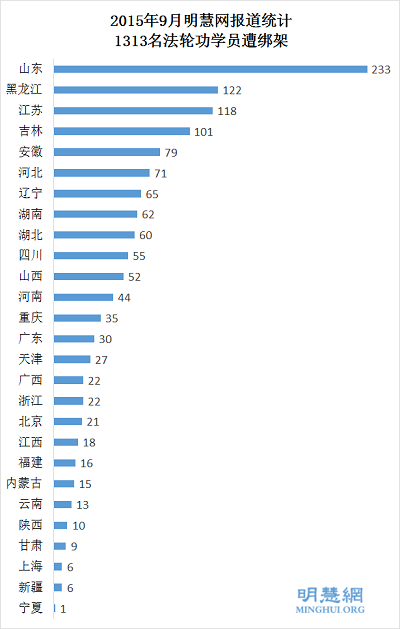 迫害最严重的省(直辖市)是:山东233人,黑龙江122人,江苏省118人,吉林101人,安徽79人,河北71人,辽宁64人;湖南62人,湖北60人,四川55人,山西52人,河南44人,重庆35人,广东30人,天津27人。