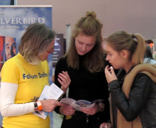 一位推着婴孩车的男士从法轮大法的摊位前走过,他告诉学员他过去听说过法轮功(也称法轮大法)受中共迫害的事。他称自己已在一种方法中练习,不想了解别的修炼方法。他说:“我来博览会只是转转看看,我不会接受任何资料,我不想打乱自己的方法。”学员微笑着给他介绍:在法轮大法中修炼,修的是宇宙特性“真、善、忍”,对任何人都只有益处,如果失之交臂那太可惜了,不要失去了解大法的机会。他看了看学员,觉得修炼“真、善、忍”的人说的话是可信的。他拿了资料表示回去要了解大法。