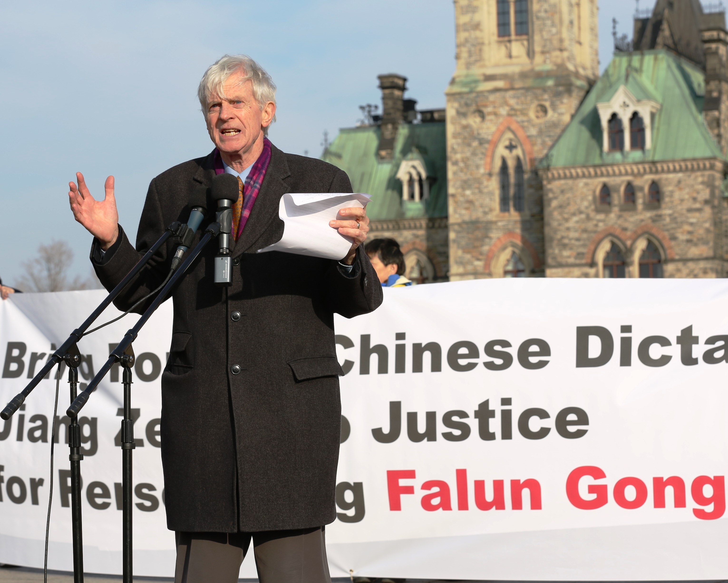 他呼吁中国领导人站在历史的正义的一边,“对待法轮功的态度,将是一个试金石,检验中国是否能和世界其它地区一起站在历史正义的一边。”