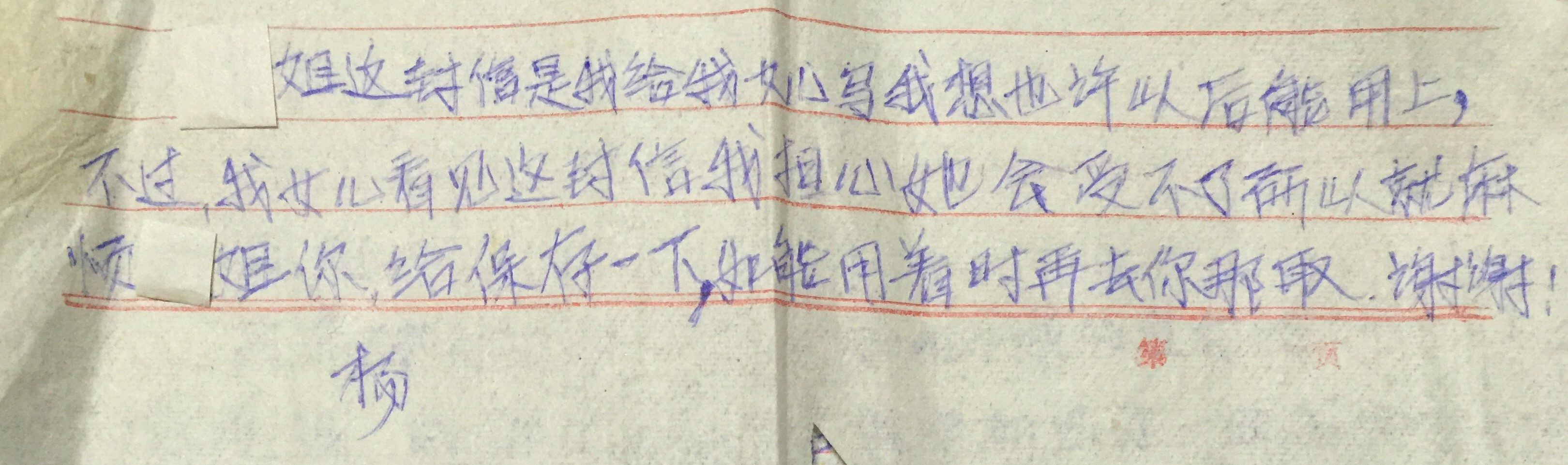 注:D姐,这封信是我给我女儿写的,我想也许以后能用上,不过,我女儿看见这封信我担心她会受不了,所以就麻烦D姐你给保存一下,如能用着时再去你那取。谢谢!