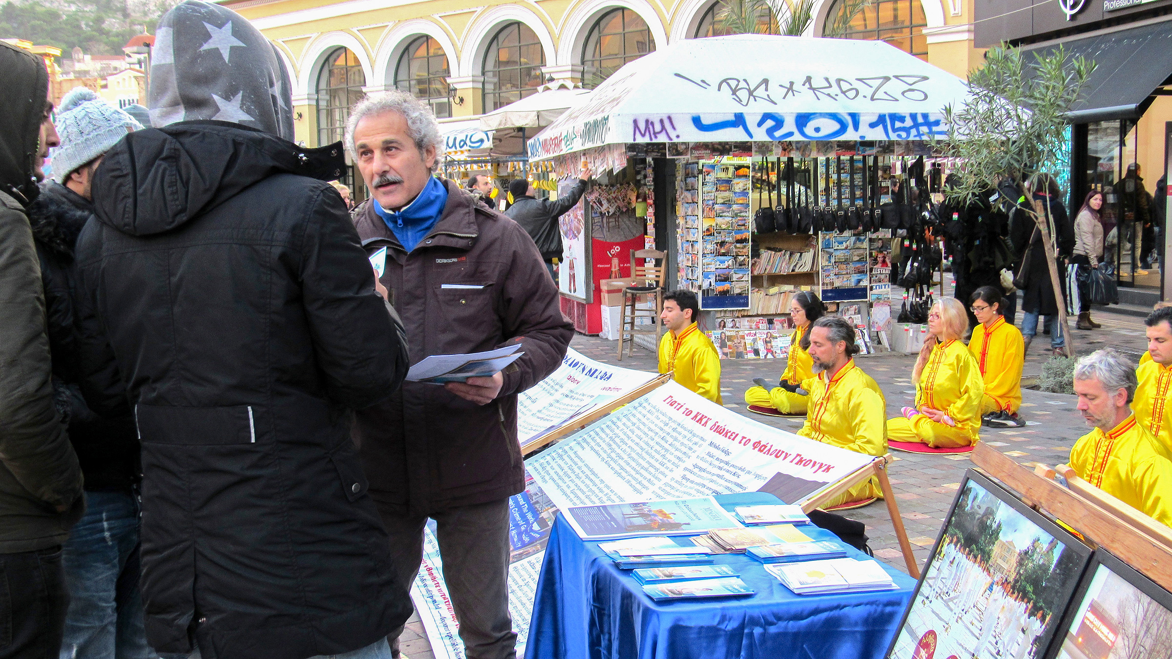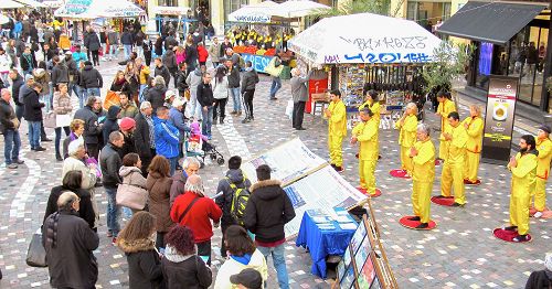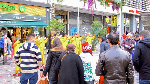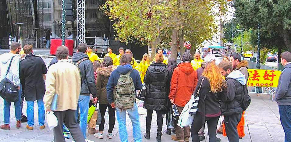 十二月十二日下午两点,法轮功学员来到雅典市中心火车站广场演示功法,讲真相,征签诉江。这里是热闹地带,民众经过时,都来观看功法演示,了解法轮功被中共活摘器官的详情。