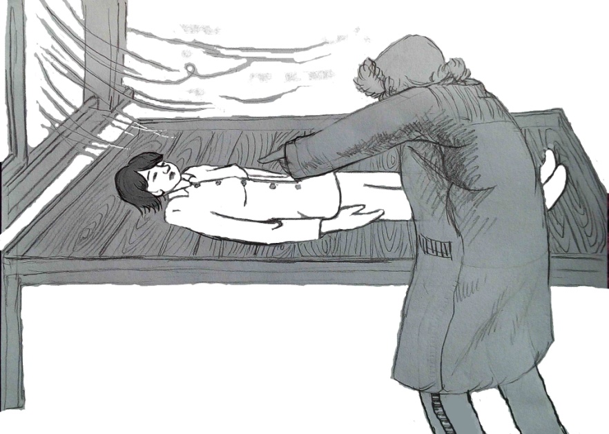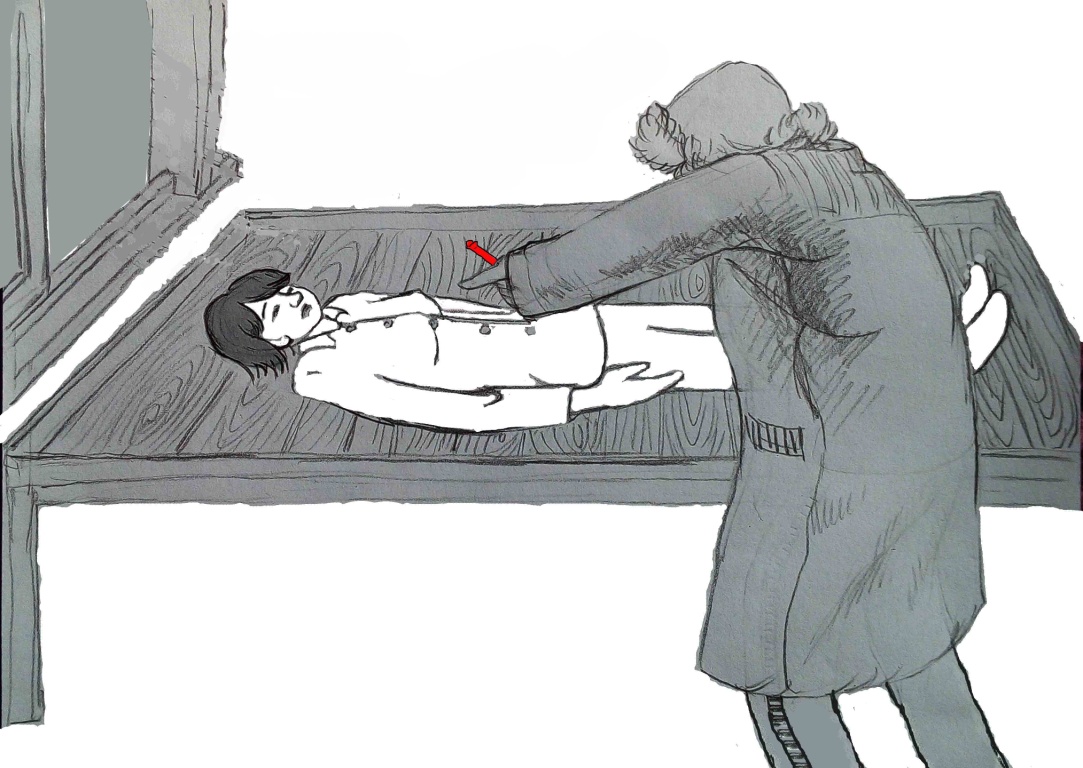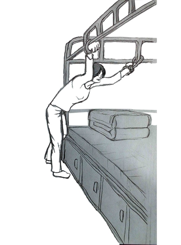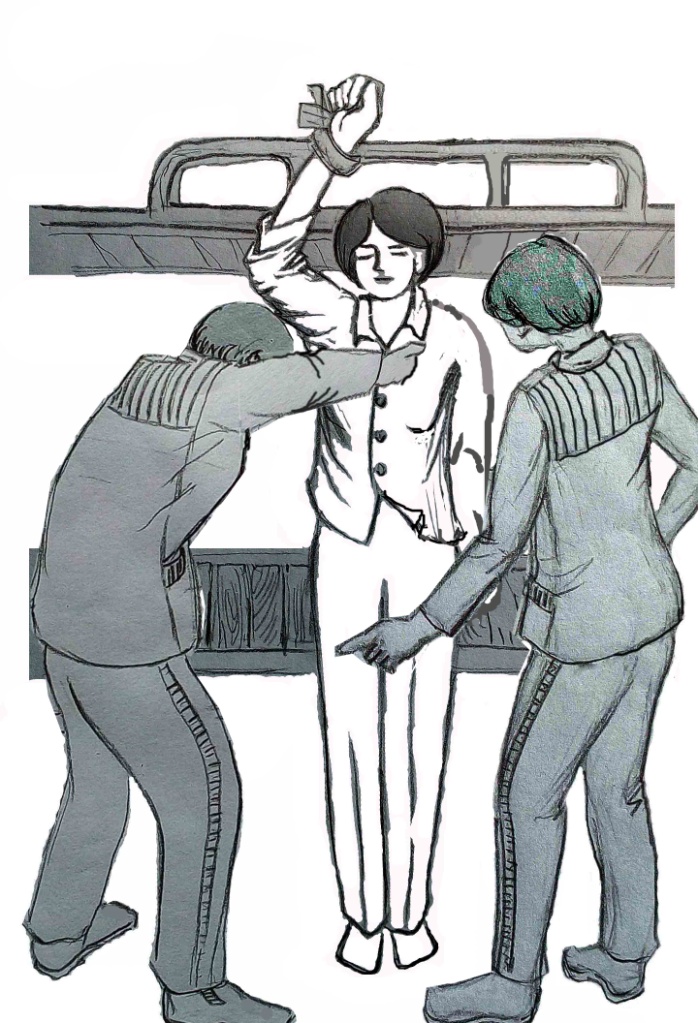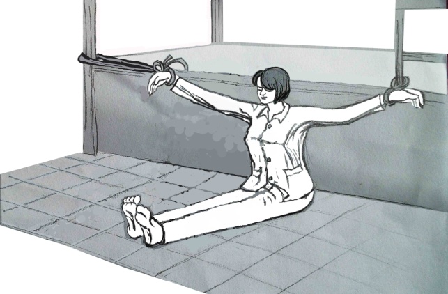 恶人又把张艳弄站起来,左手伸到床里边,用手铐铐在床的侧面立柱上,右手铐在床的正面上铺横梁上,脚底下有铁皮柜挡着,局限两脚位置不能向前受力,只能身体前倾,身体重量都落在两个手铐与手腕的接触部位。不久手腕就被手铐勒破出血。包夹们就用枕巾或毛巾把张艳手腕缠上再上手铐。他们高兴了让她上厕所,不高兴一天都不让上一次厕所,尿裤了就在身上焐干,还总骂张艳脏身上有味。