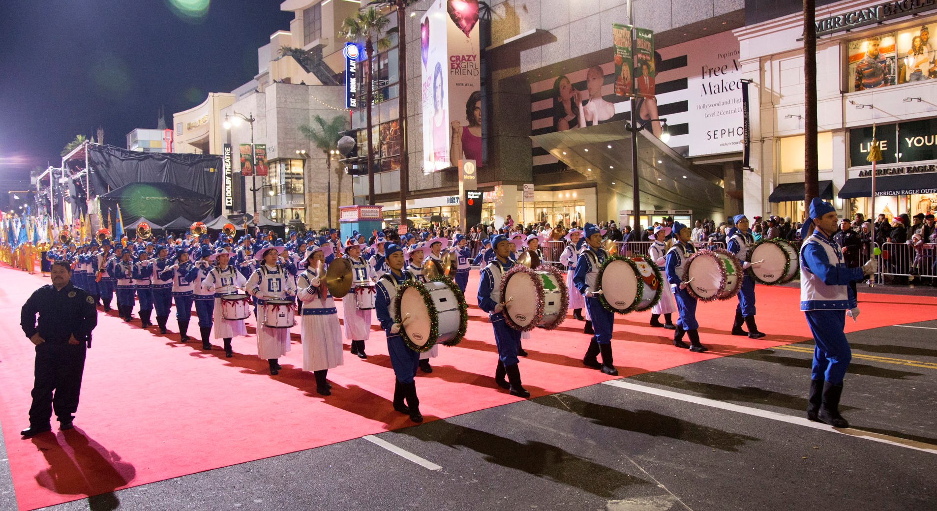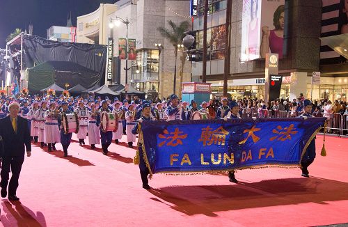 法轮功学员的游行队伍自二零零五年首次亮相好莱坞大游行,备受瞩目。穿着中国古装的天国乐团响亮的演奏振奋人心,美丽的花车上法轮功学员祥和的功法表演,手拿琵琶、翩翩起舞的仙女,旗队与腰鼓队表演为好莱坞带来浓浓的东方韵味。