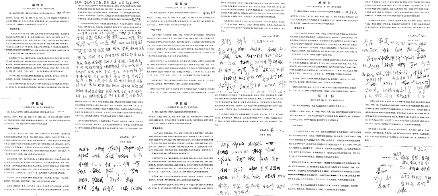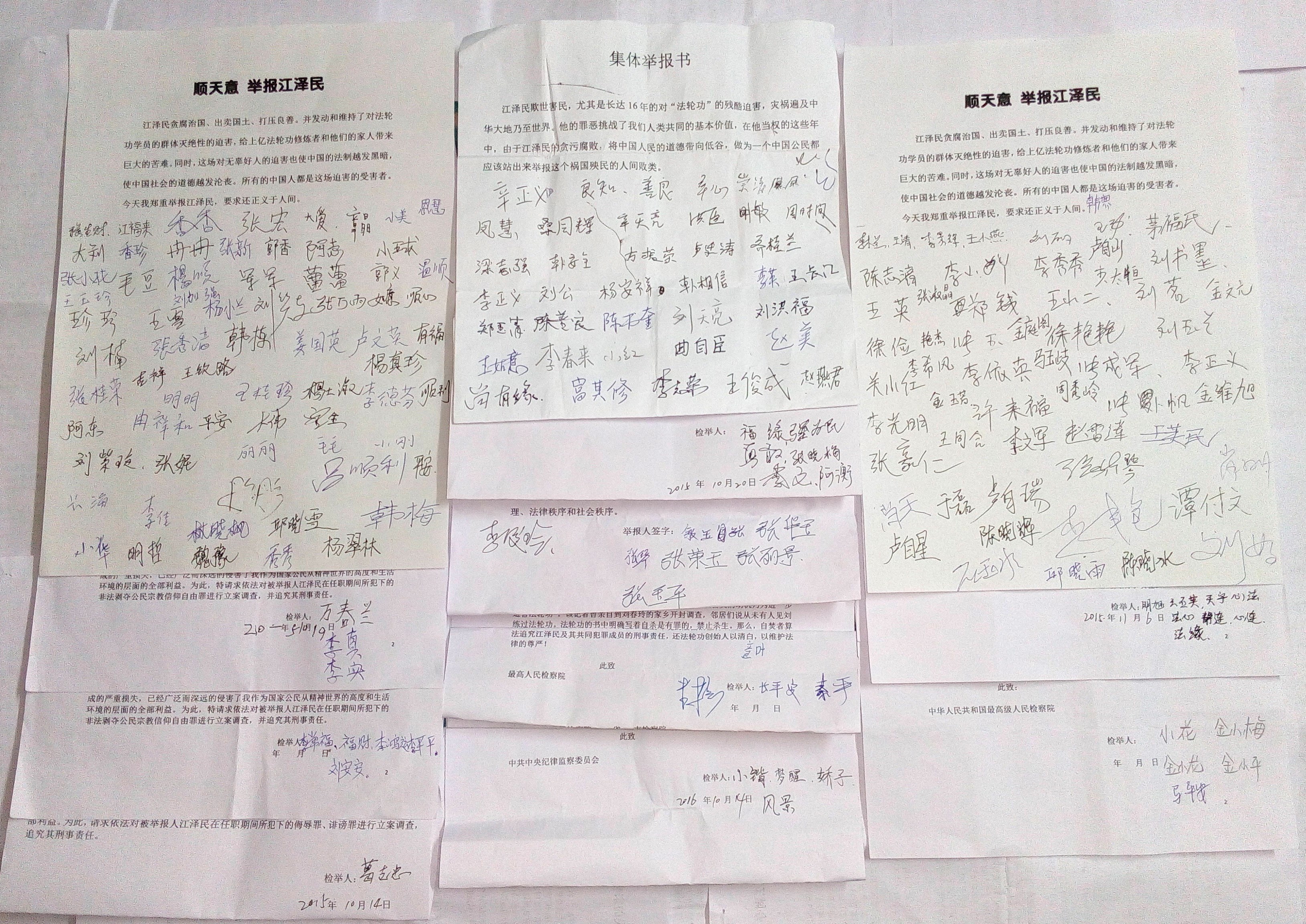 ![]() 举报江泽民迫害法轮功信件一份,57人签名; 声援起诉江泽民签名表三张,164人签名 |
