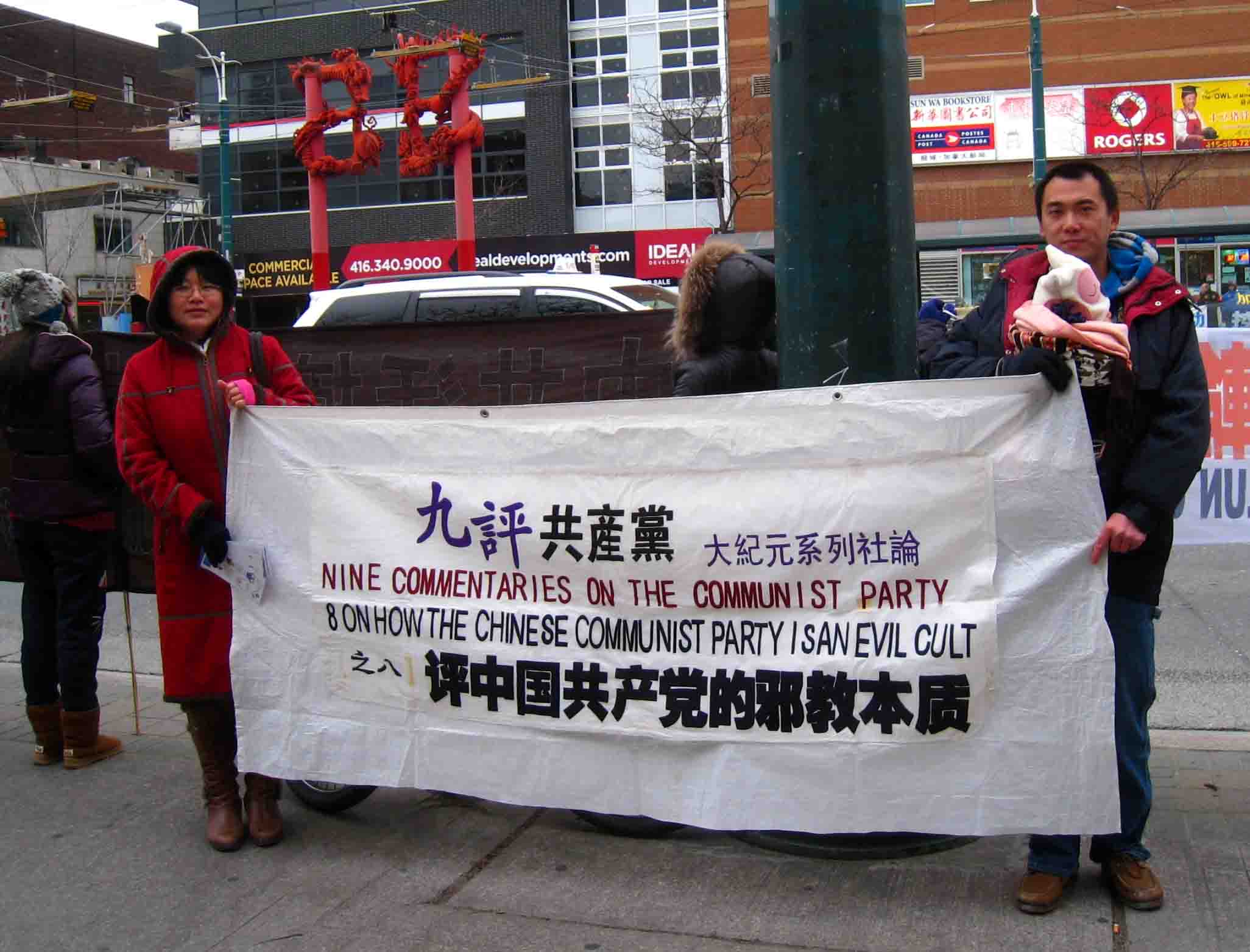 ![]() 图2:多伦多法轮功学员朱先生和太太李女士在严寒中打横幅 |