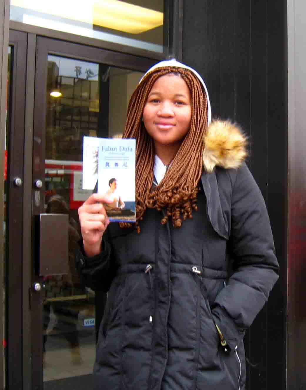 Juliana女士在“制止中共活摘法轮功学员器官”的征签表上签了名,并接下了法轮功真相传单。