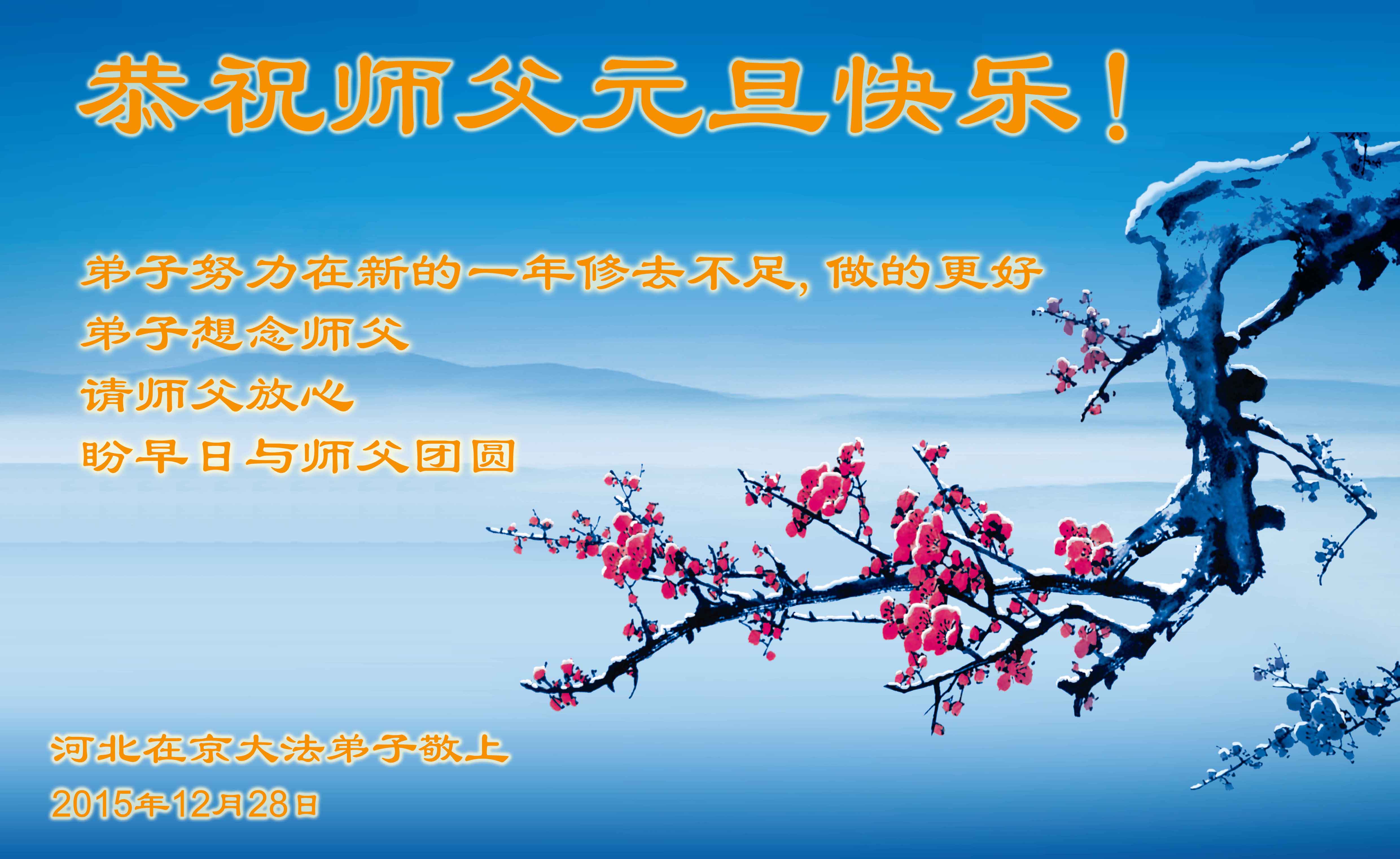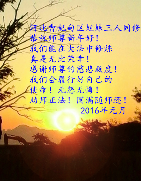 2016年元旦到来之际,北京清华大学大法弟子向慈悲伟大的师尊致以最崇高的敬意!恭祝伟大的师尊2016年元旦快乐!师父您好!师父您辛苦了!我们要更加珍惜伟大师尊为弟子救度众生延续的宝贵时光,做好三件事,跟师父回家。