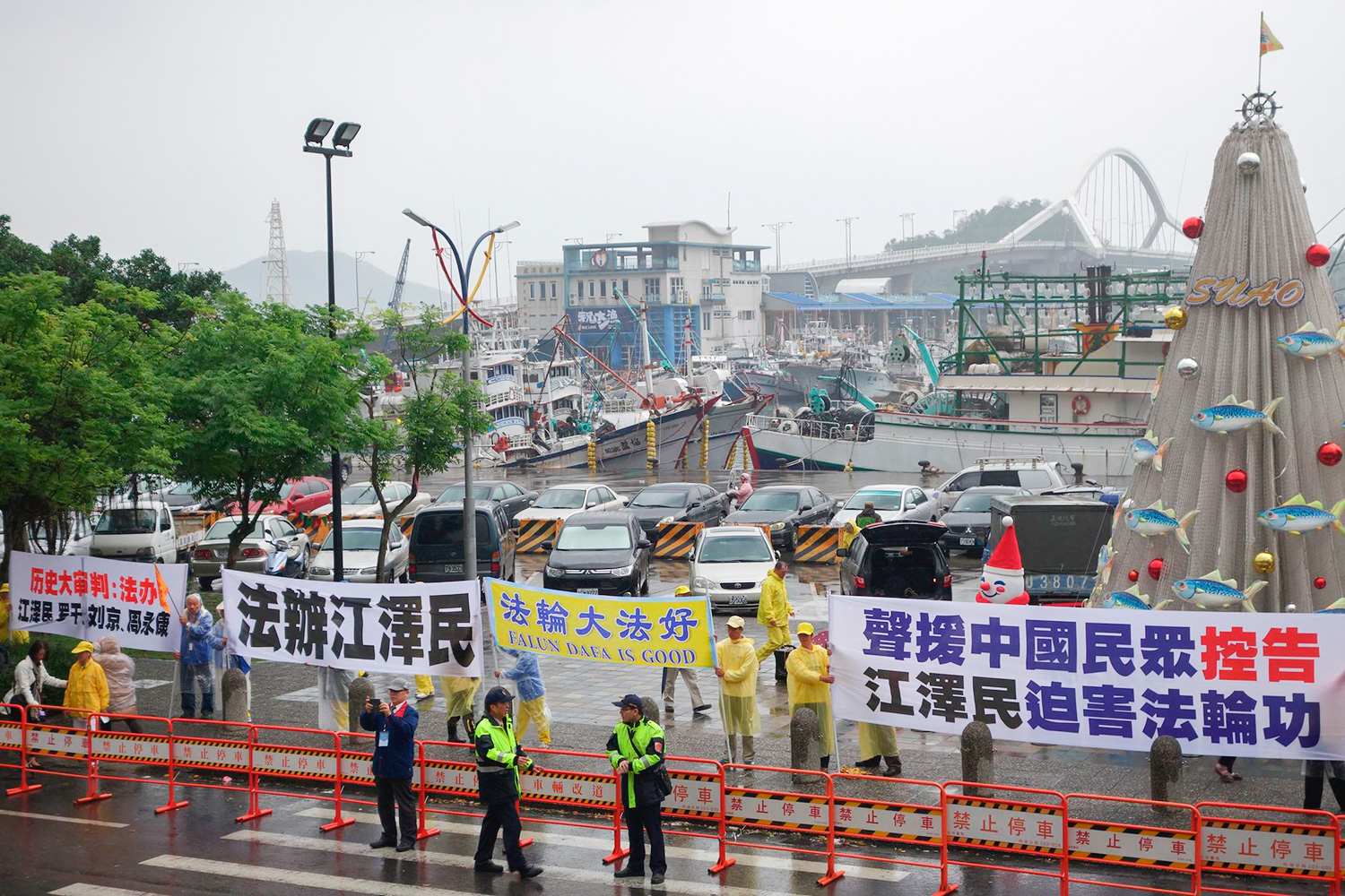 ![]() 图2:法轮功学员在宜兰南方澳进安宫抗议陈德铭,要求“停止迫害法轮功,法办江泽民” |