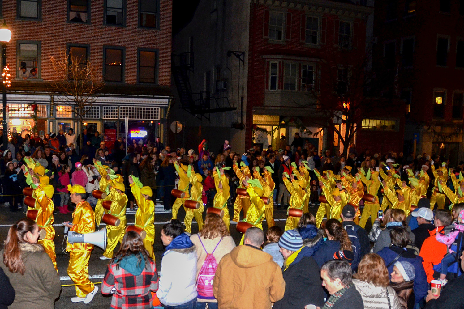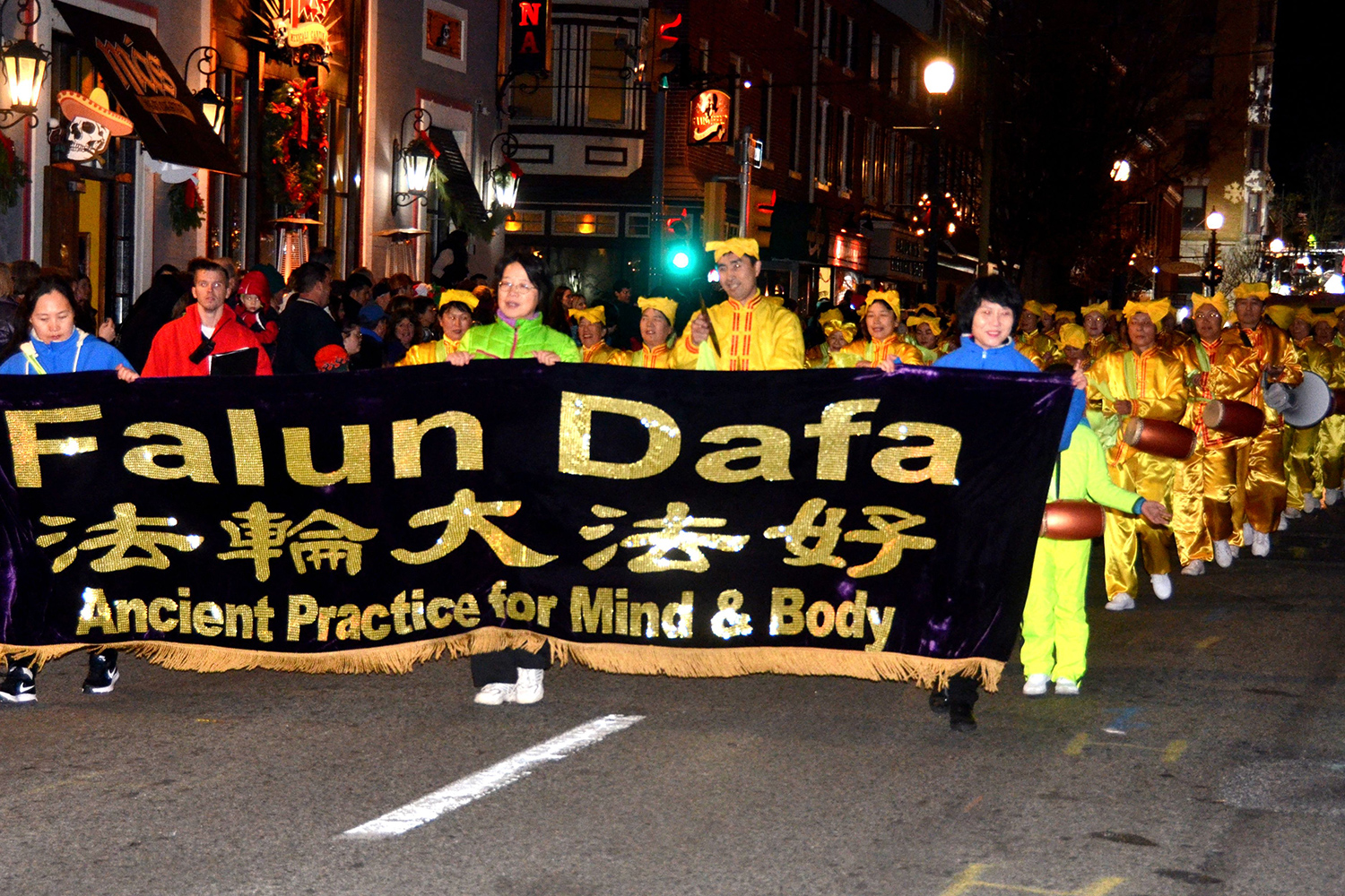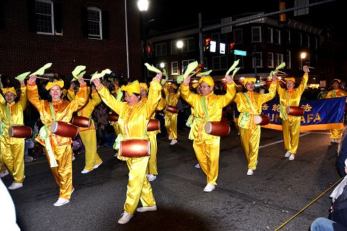 每年的游行队伍中,法轮功学员组成的腰鼓队都是唯一的华人团体。学员们身着黄色传统服饰,在夜幕里斑斓的灯光下特别醒目。伴随着“法轮大法好”的音乐,他们踏着整齐的步伐,敲着振奋人心的鼓声,沿途受到民众的热烈欢迎。许多人注视着这个独具特色的腰鼓队,眼神中充满了对东方文化的敬意。