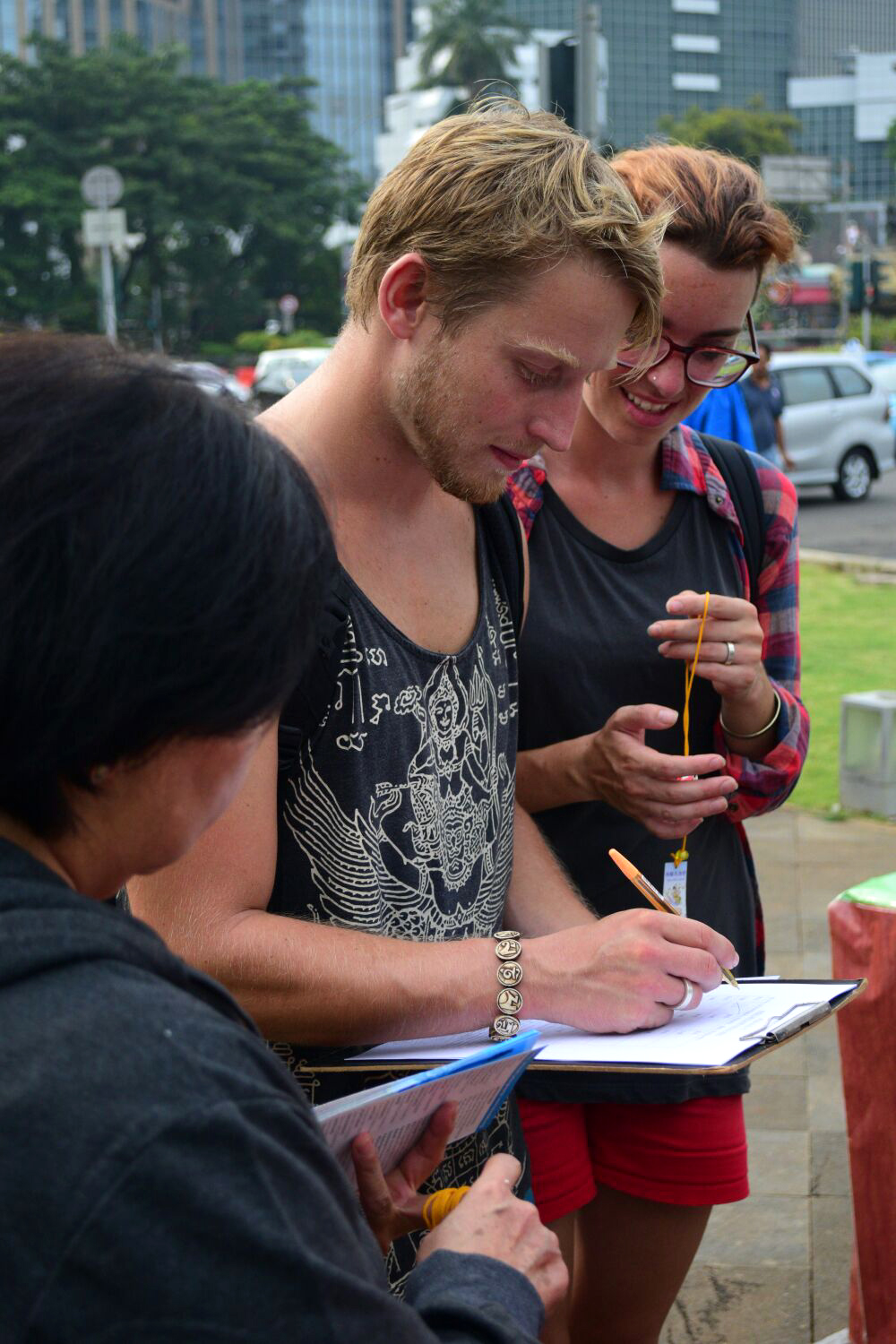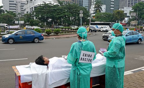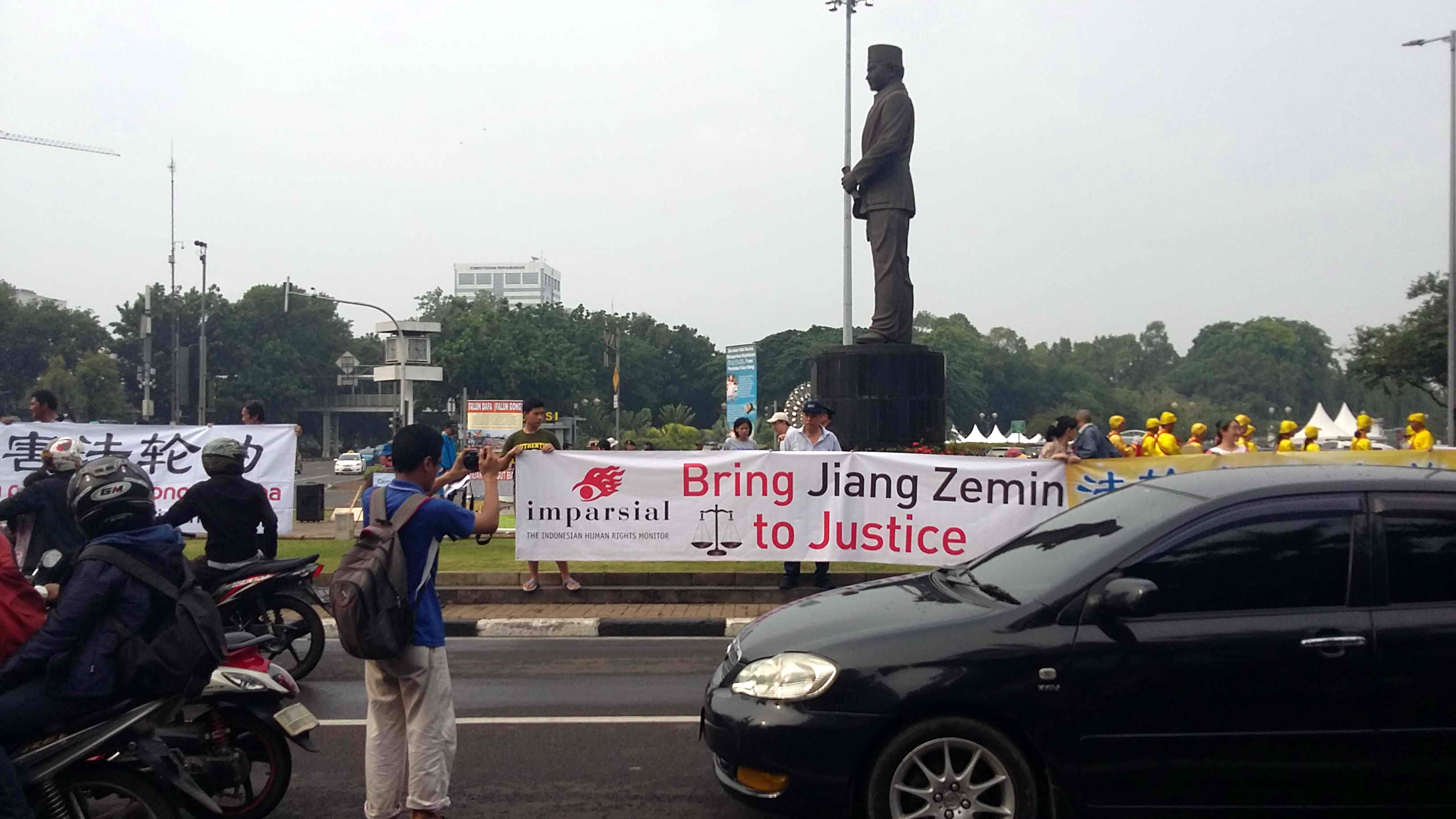 学员们一边展开横幅,一边扮演中共活摘法轮功学员器官。自从一九九九年法轮功在中国遭受迫害以来,中国的器官移植也爆炸式增长。世界上每年都有成千上万的患者,包括印尼的患者,到中国做器官移植,因为等待时间超短,中国成为人们前往做器官移植的主要目的地。据加拿大前亚太司司长、前资深国会议员大卫•乔高和知名人权律师大卫•麦塔斯的独立调查证明,在中国,活摘法轮功学员器官的罪恶的确存在,而且数量惊人,他们形容这是“这个星球上从未有过的罪恶——却在中国每天发生着”。