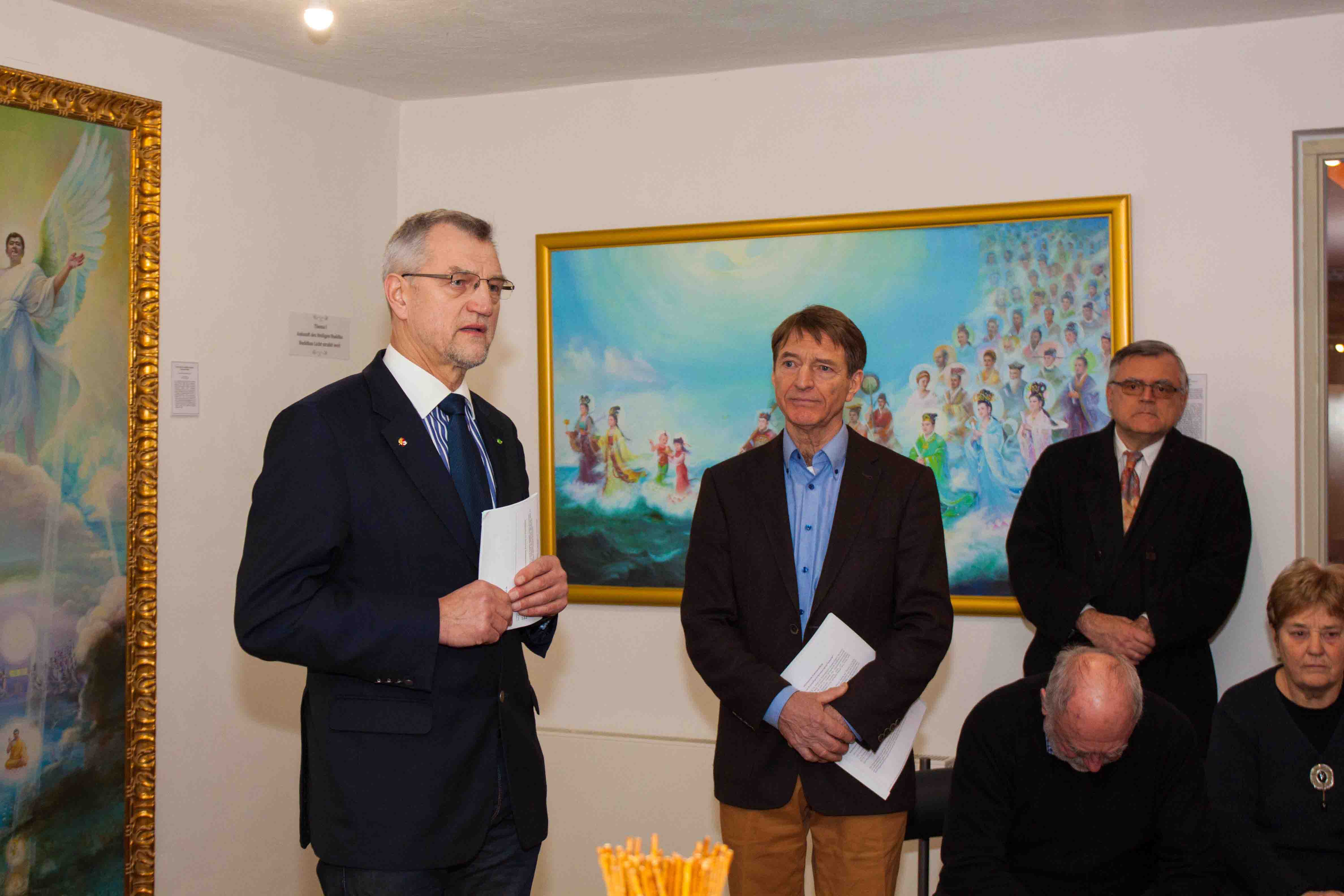 科隆市内城区区长安德里亚斯•胡普克(Andreas Hupke)在致词中表示,在迫害和不公正发生的时候,没有人可以沉默。他说:“即便中共(因我参加今次活动)禁止我入境,我也无所谓。人得能够大声说出自己的想法。每个政治家必须(对迫害)说,“不行”。这类事情(中共对法轮功的迫害)发生在这样的一个国家,对我个人触及非常大。科隆是北京的友好城市,这已是事实。我们得有勇气(对迫害)发出反对声音。在这个意义上,我对这些画作的艺术家们和展出的支持者们鞠一躬。让我们为正义抗争。最糟糕的莫过于这类事情在众人的沉默中继续发生。在不公正发生的时候,不可以沉默。”